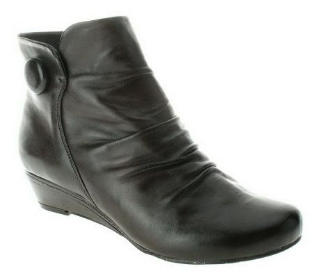 Well heeled. Taking the boot style to new heights, this wedge-heeled bootie sports ruching on the forefoot and a decorative button on the outside of the upper shaft. Distinct and dazzling! From Spring Step.