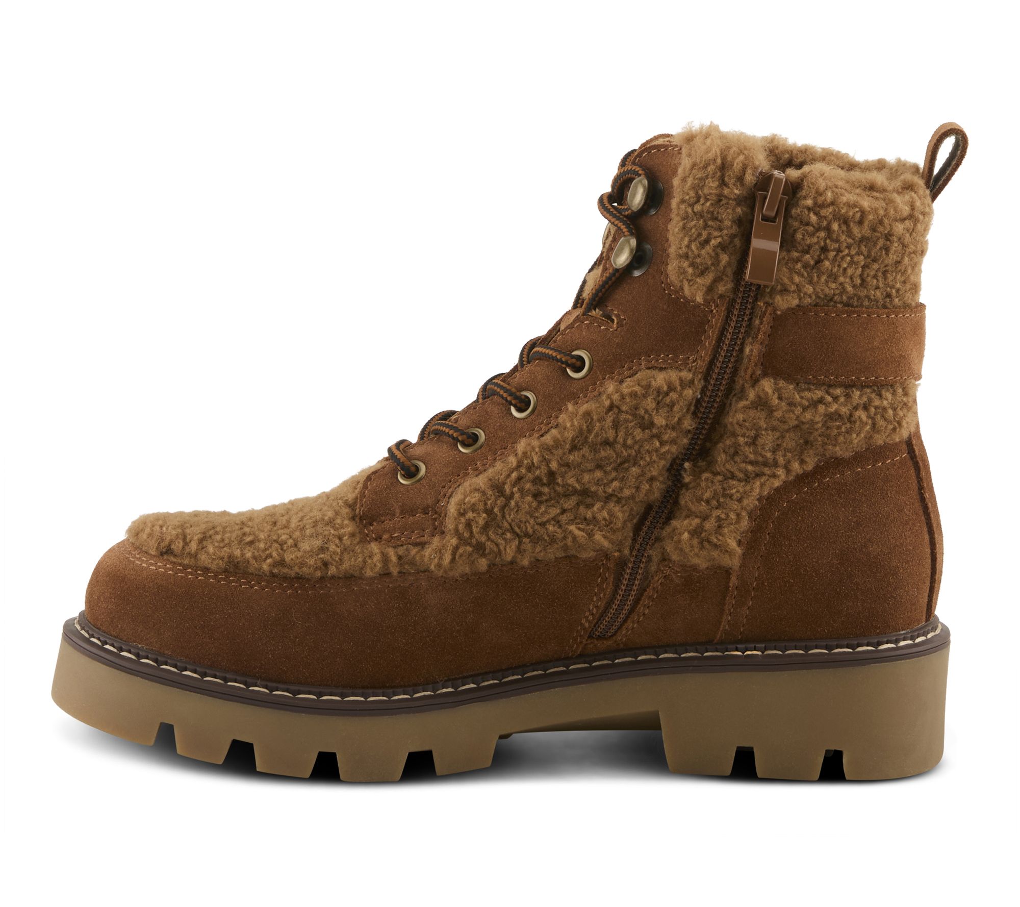 Features a plush sherpa upper with suede paneling, rounded toe, contrast stitching on welt, inside zipper closure