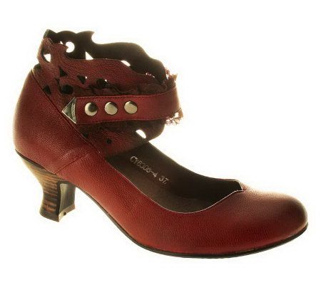 Perfect for any uptown girl, these sophisticated leather pumps feature a detailed die-cut leather pattern that wraps around the ankle and is secured in place with a hook-and-loop strap. The strap is the real focal point with three metal buttons, a pointed metal endcap, and a touch of flirty lace. From Spring Step.