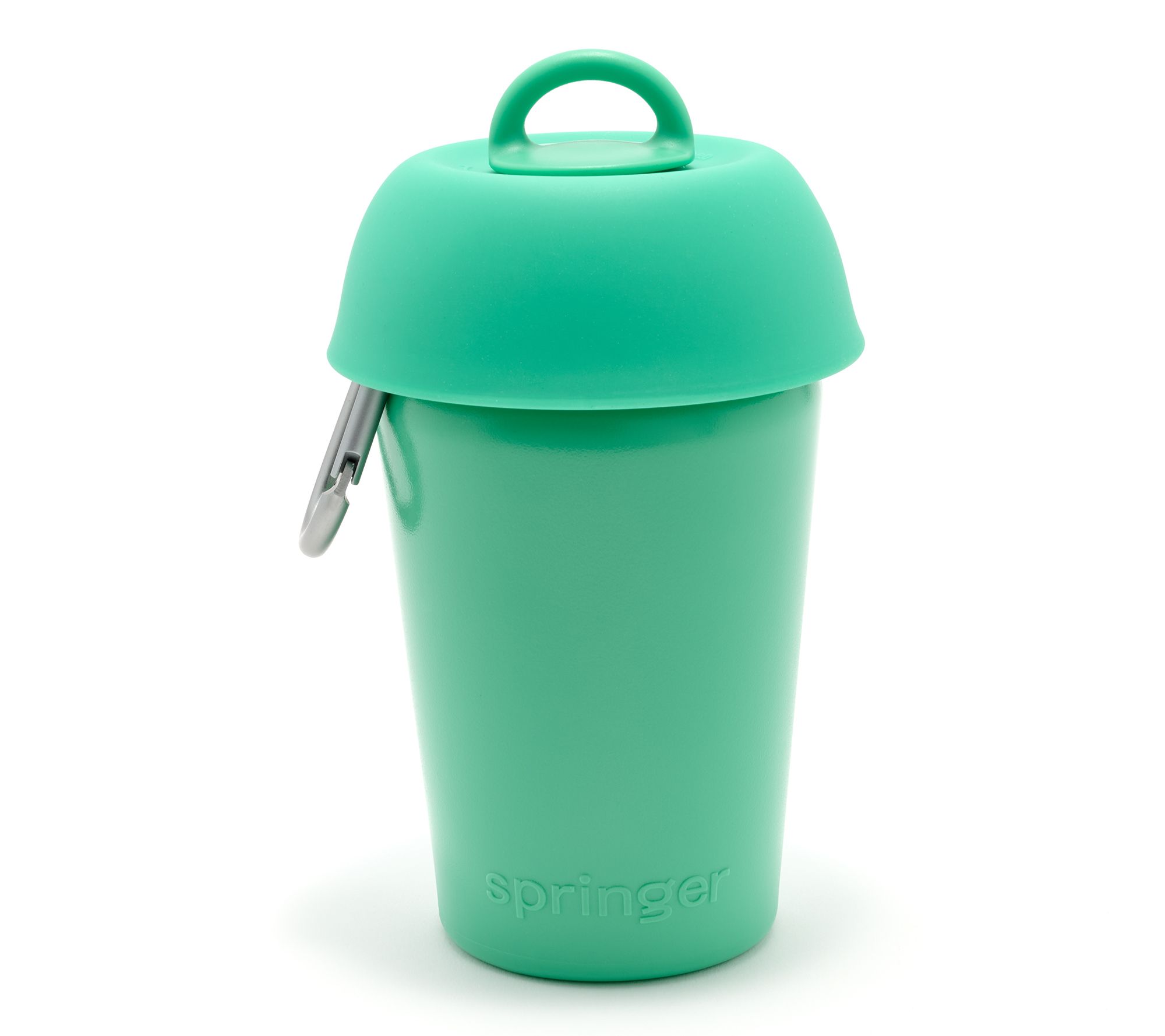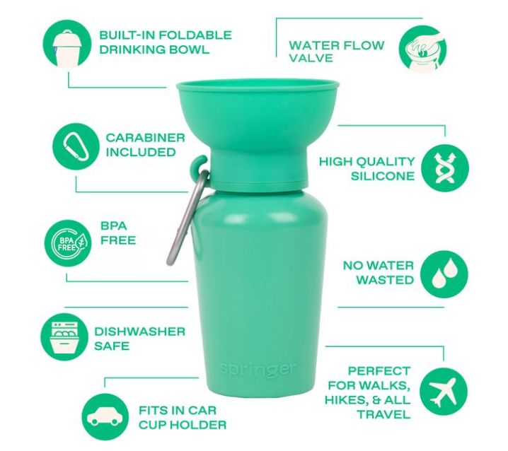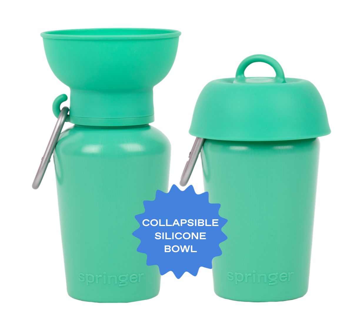 Quench your pup's thirst on-the-go with this portable dog water bottle. Featuring a built-in foldable silicone bowl, the innovative design makes it easy to squeeze and release water and then drain the excess without spills or wastage. The compact and lightweight bottle fits in most cup holders and includes a carabiner for easy attachment to your leash or bag. From Springer.
