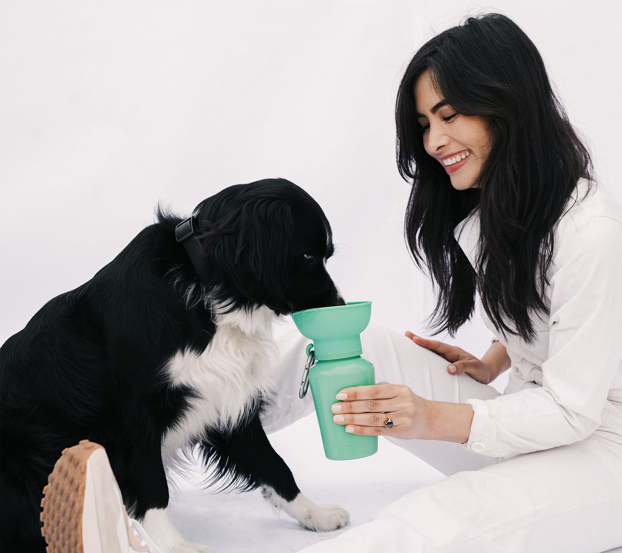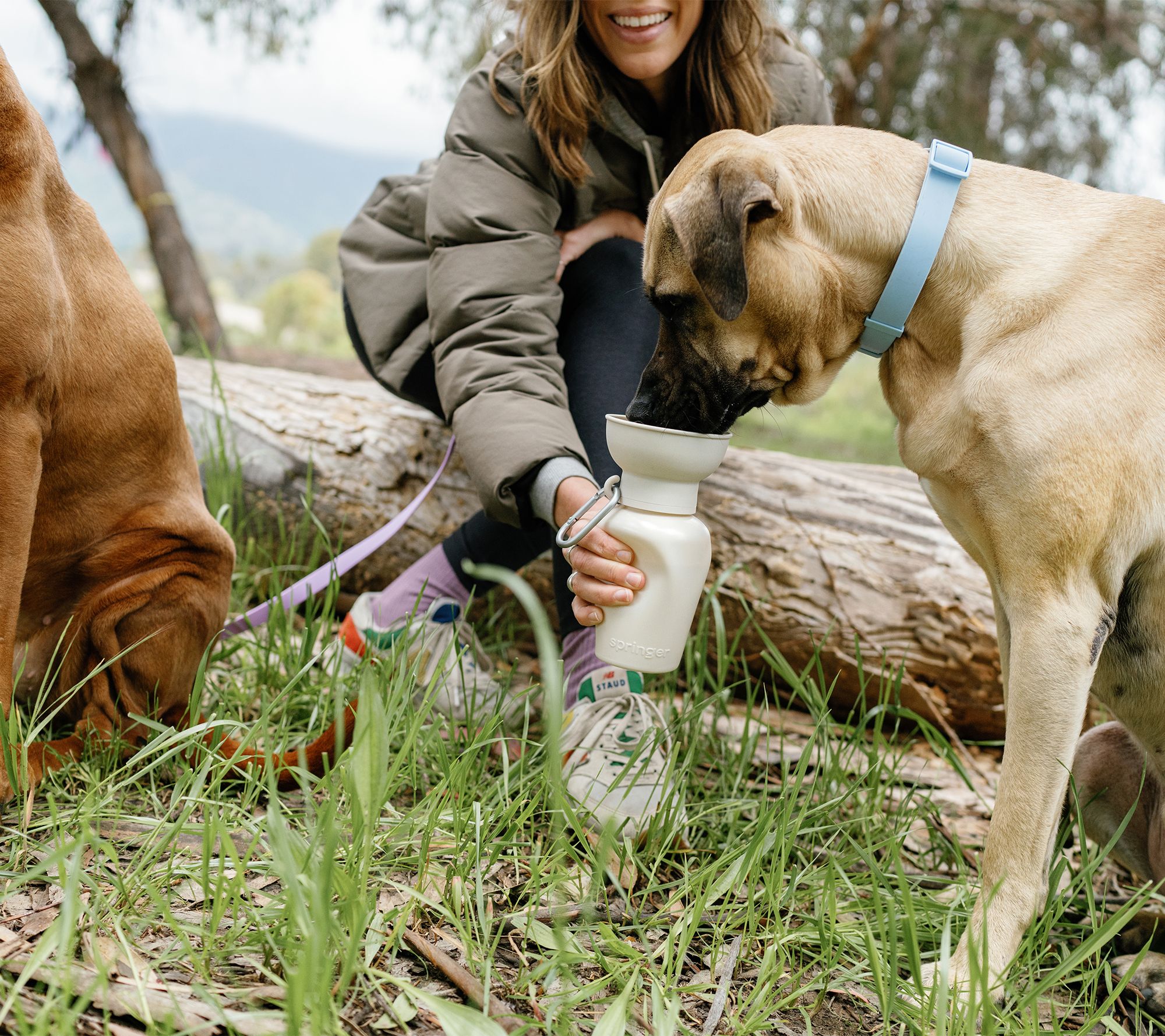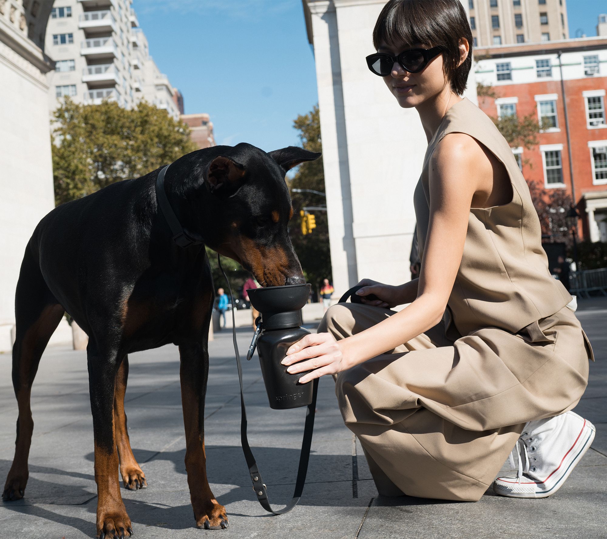 Quench your pup's thirst on-the-go with this portable dog water bottle. Featuring a built-in foldable silicone bowl, the innovative design makes it easy to squeeze and release water and then drain the excess without spills or wastage. The compact and lightweight bottle fits in most cup holders and includes a carabiner for easy attachment to your leash or bag. From Springer.