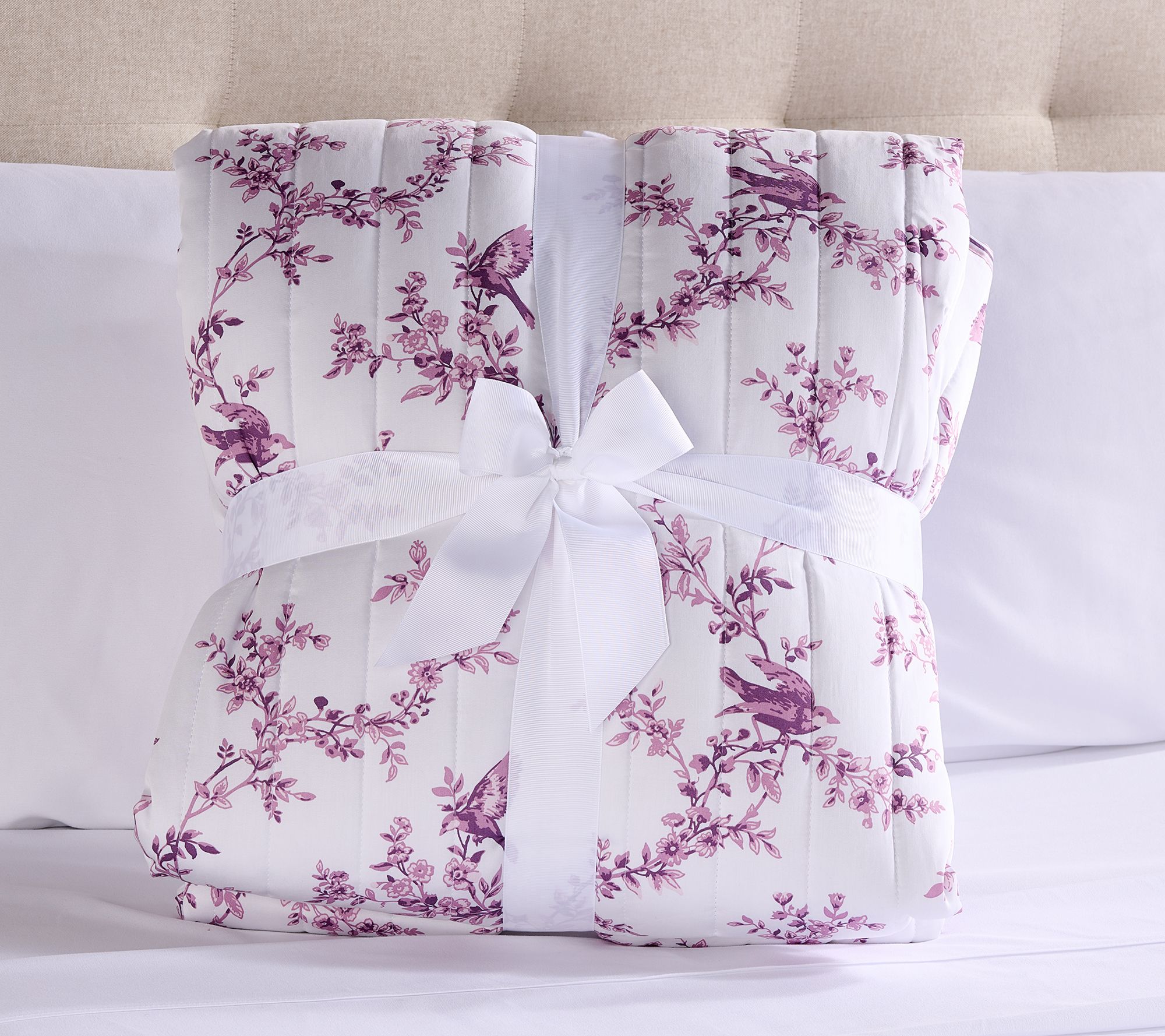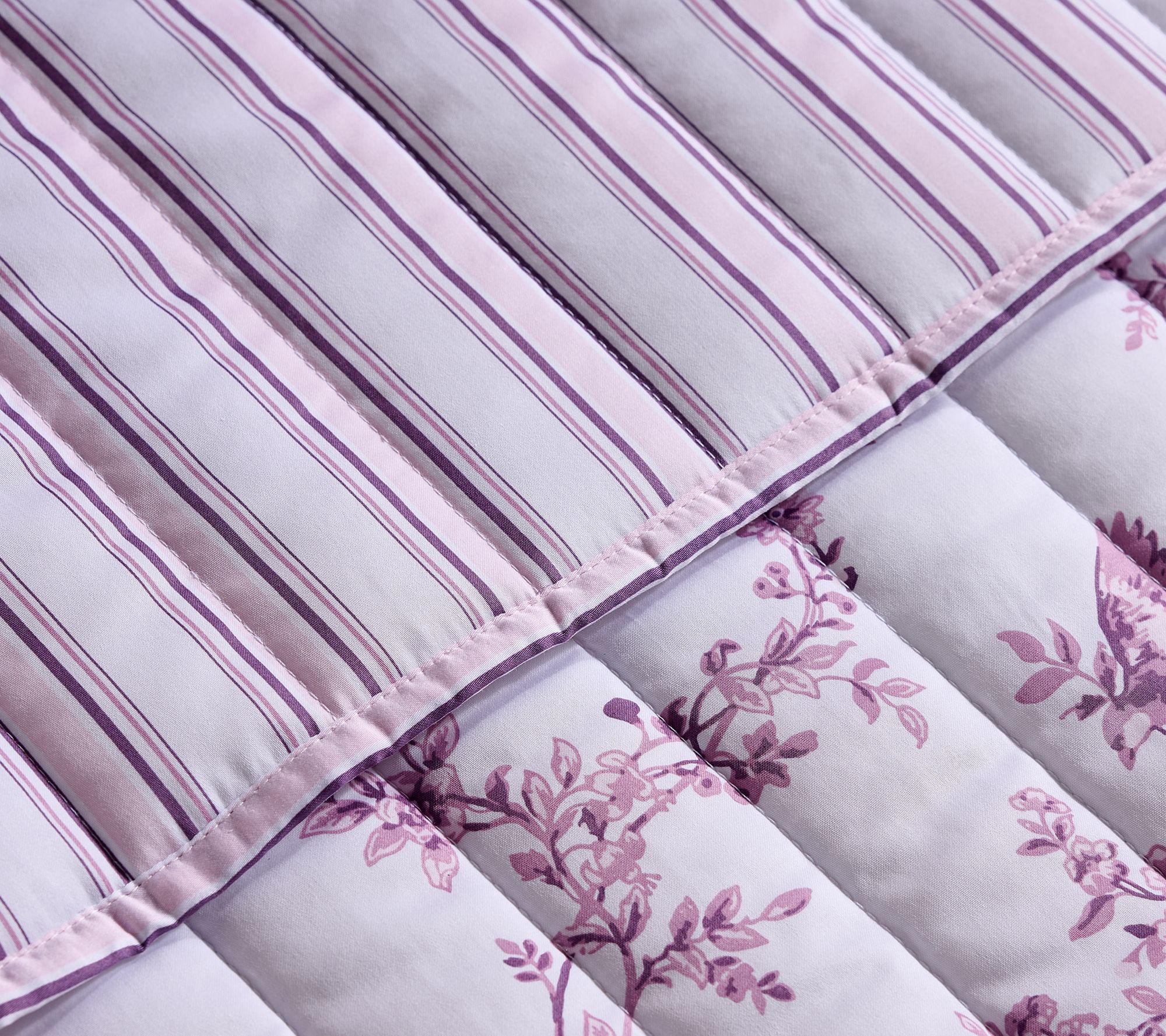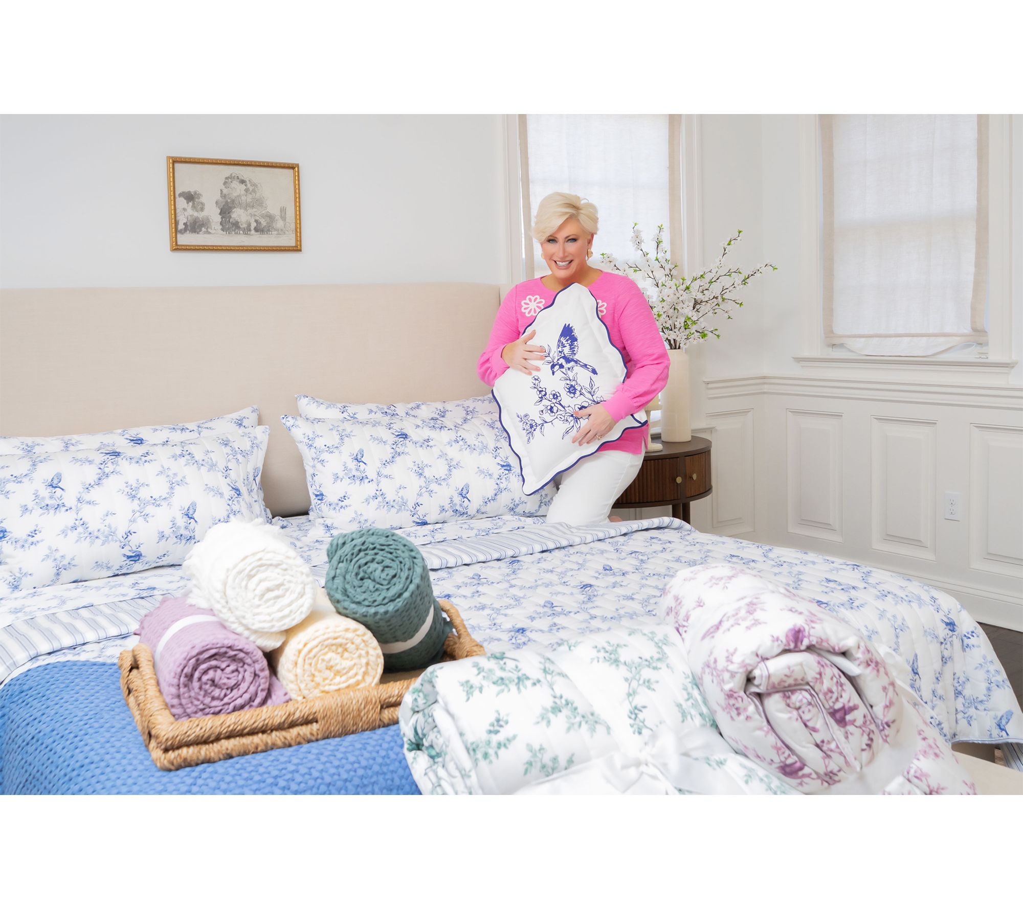 Feather your nest: springtime edition! This reversible quilt set by Kim Gravel displays a charming songbird motif paired with a striped reverse, letting you refresh your seasonal space with a flip. Quilted shams complete the set for cozy nights and cheerful mornings. From Kim Gravel.