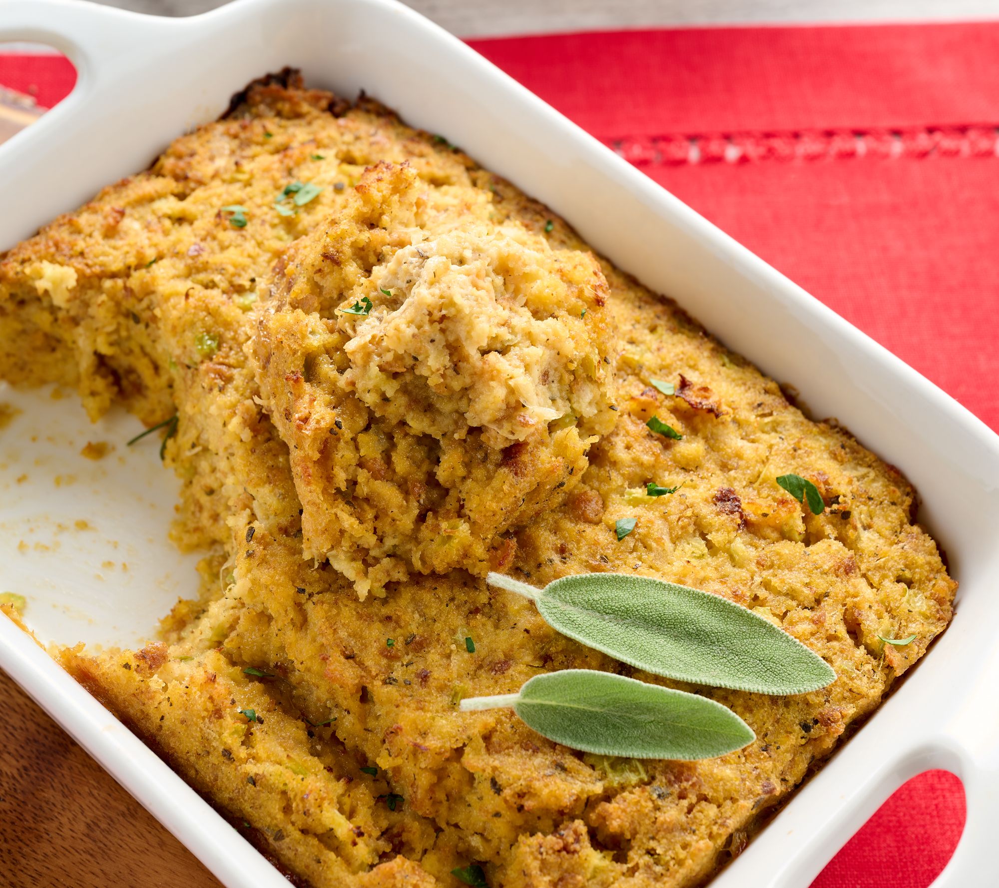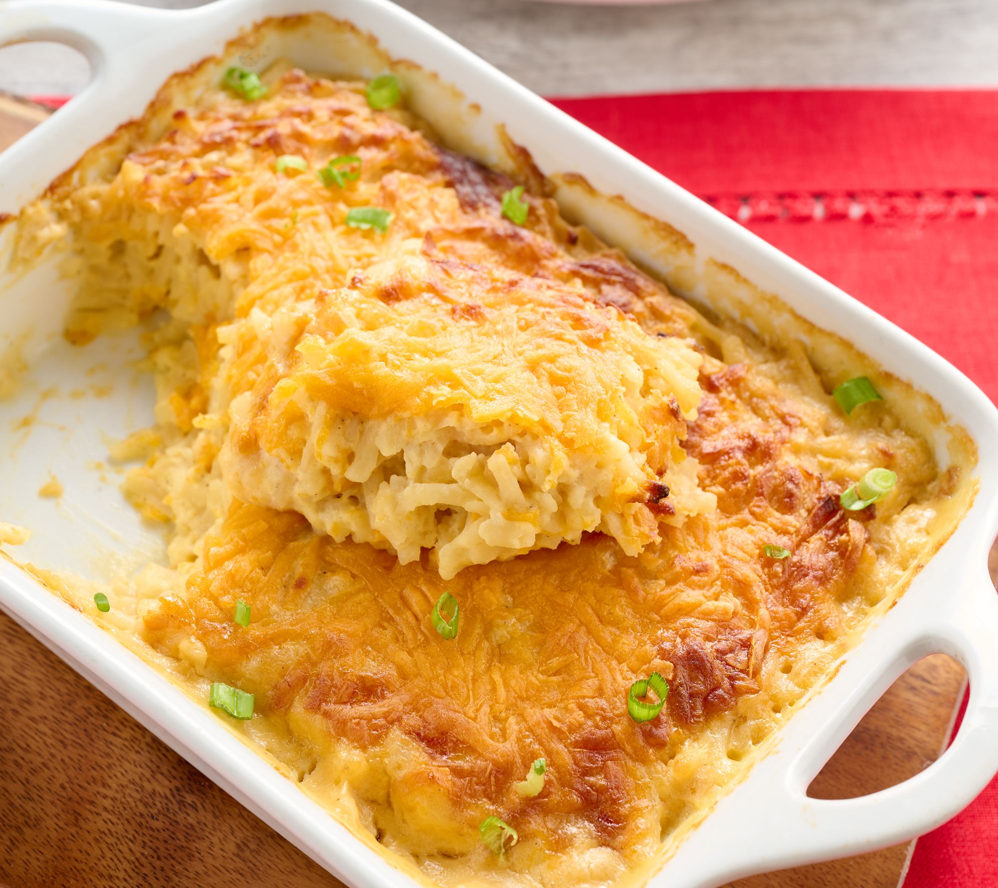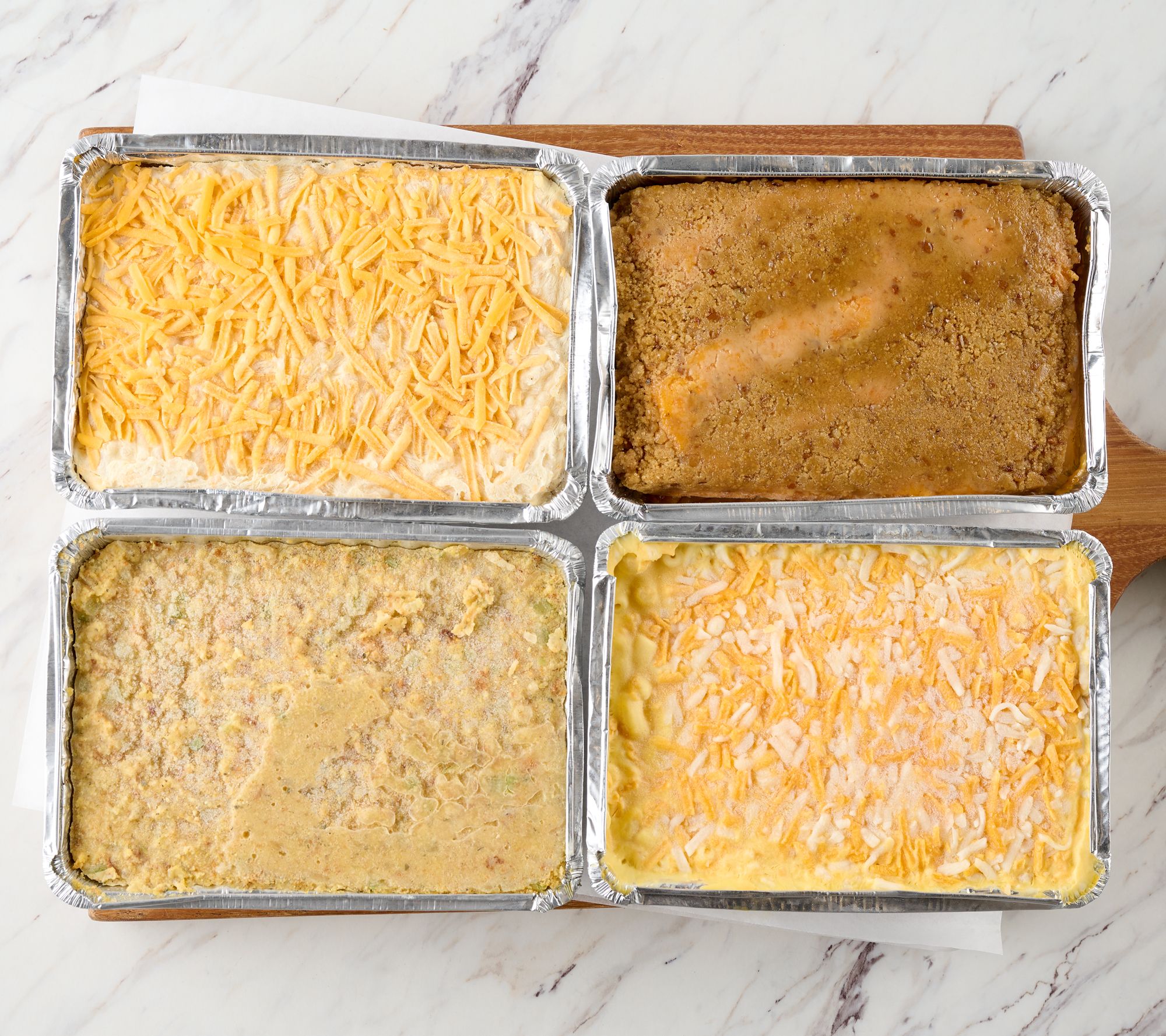 Includes four 2-lb trays of side dishes: one each of Dutch crust sweet potato casserole, cornbread dressing, cheddar hashbrown casserole, and four cheese mac and cheese