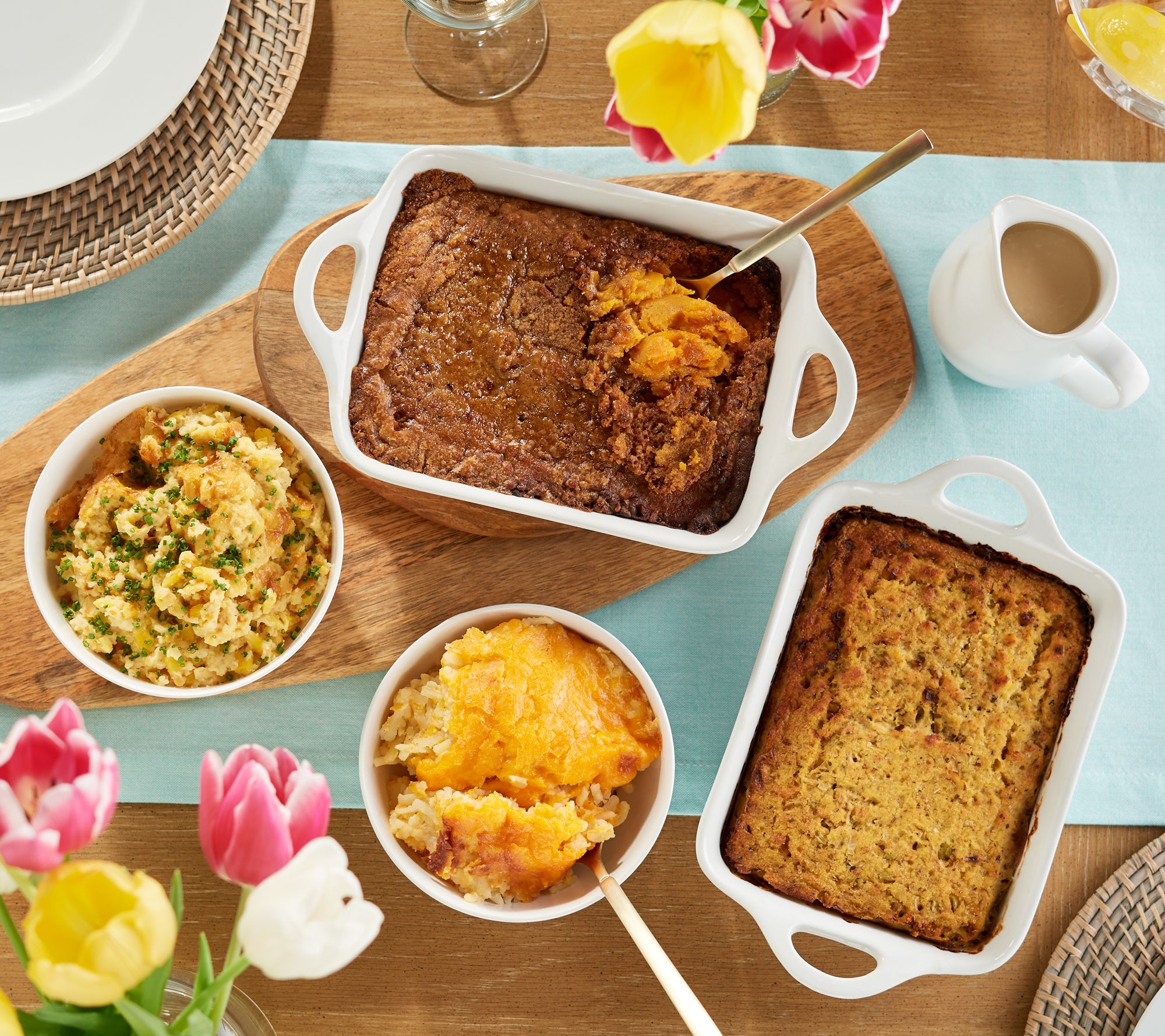 Each shipment includes four 2-lb side dishes: one each of Cheddar Hash Brown Casserole, Corn Souffle, Dutch Crust Sweet Potato Casserole, and Cornbread Dressing; and choice of 1-lb bag of Giblet Gravy or Cranberry Relish; shipments arrive approximately every 90 days for one year