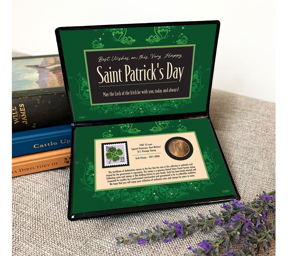• Includes greeting card with a collectible Irish penny and a US stamp
