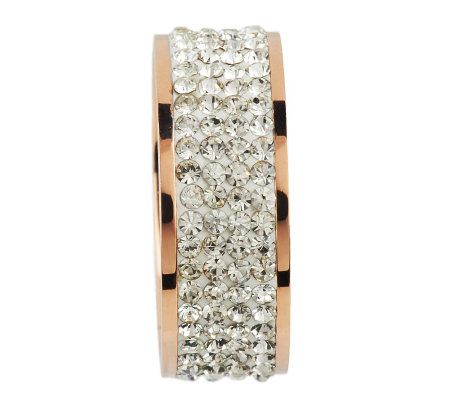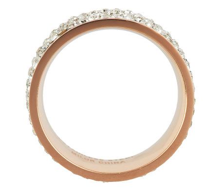 It's crystal clear. This 18K rose gold-plated stainless steel eternity band is just the accessory you need to finish off your look with some pizzazz. Clear, round crystals are set into the band and bordered by polished edges for supreme sparkle and shine. But this ring is more than just stunning--it slides onto your finger with silken comfort. From Steel by Design(R) Jewelry.