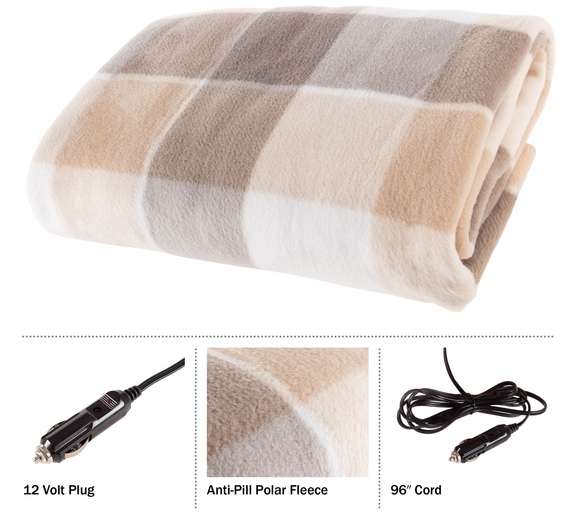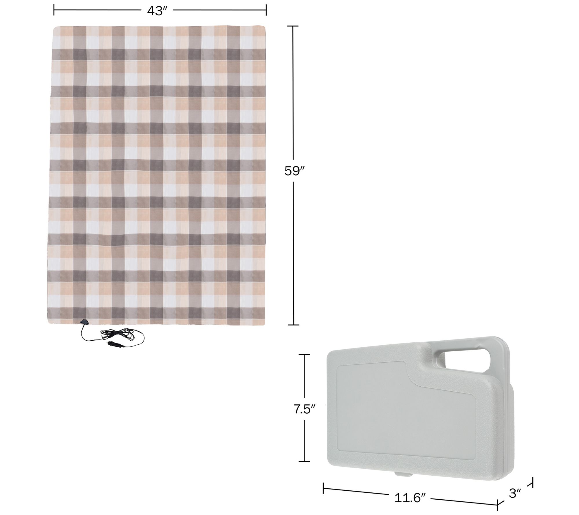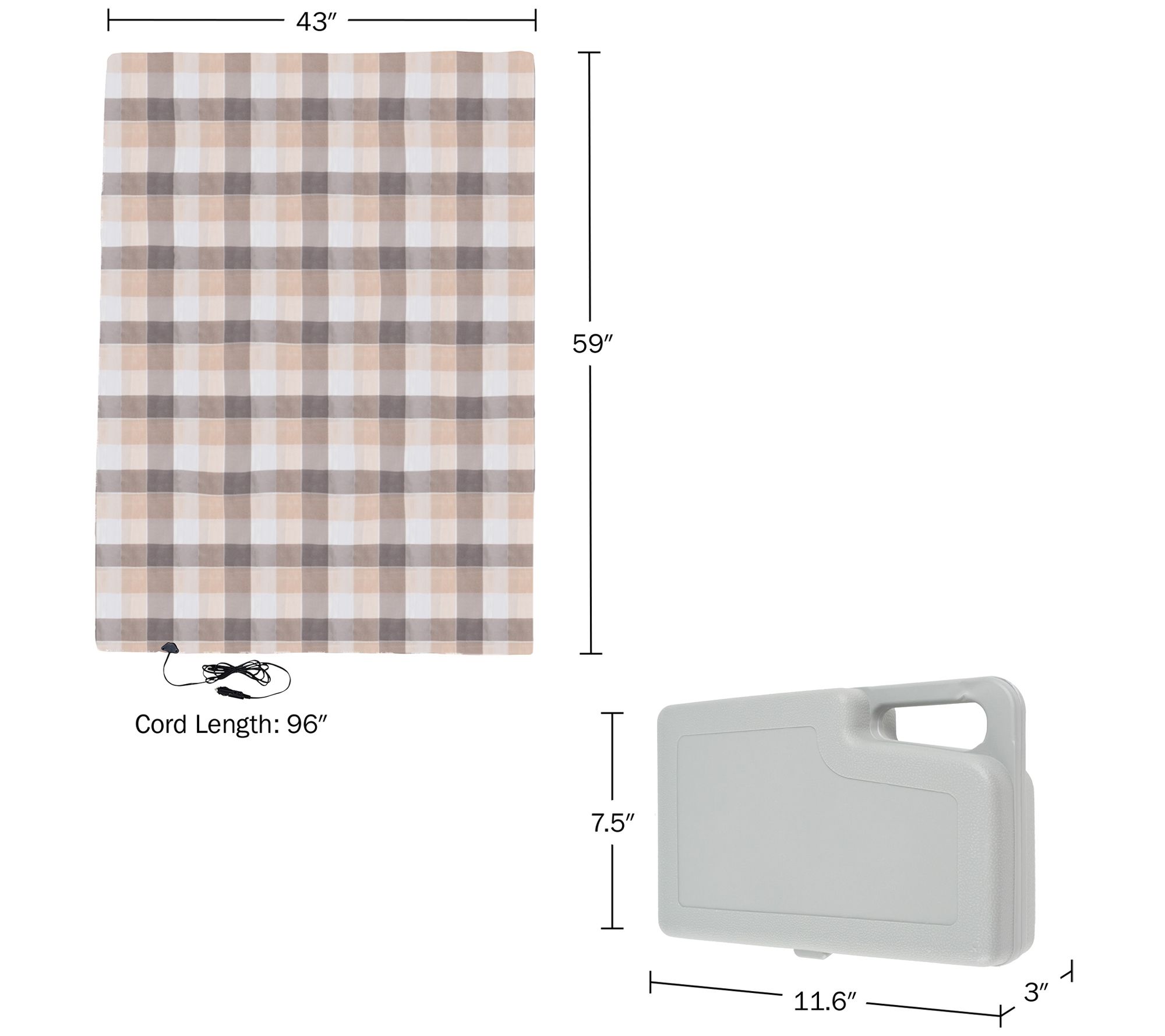 • Measurements: Carrying case 11.63"L x 7.5"W x 3"H; Blanket 59"L x 43"; Cord 96"L