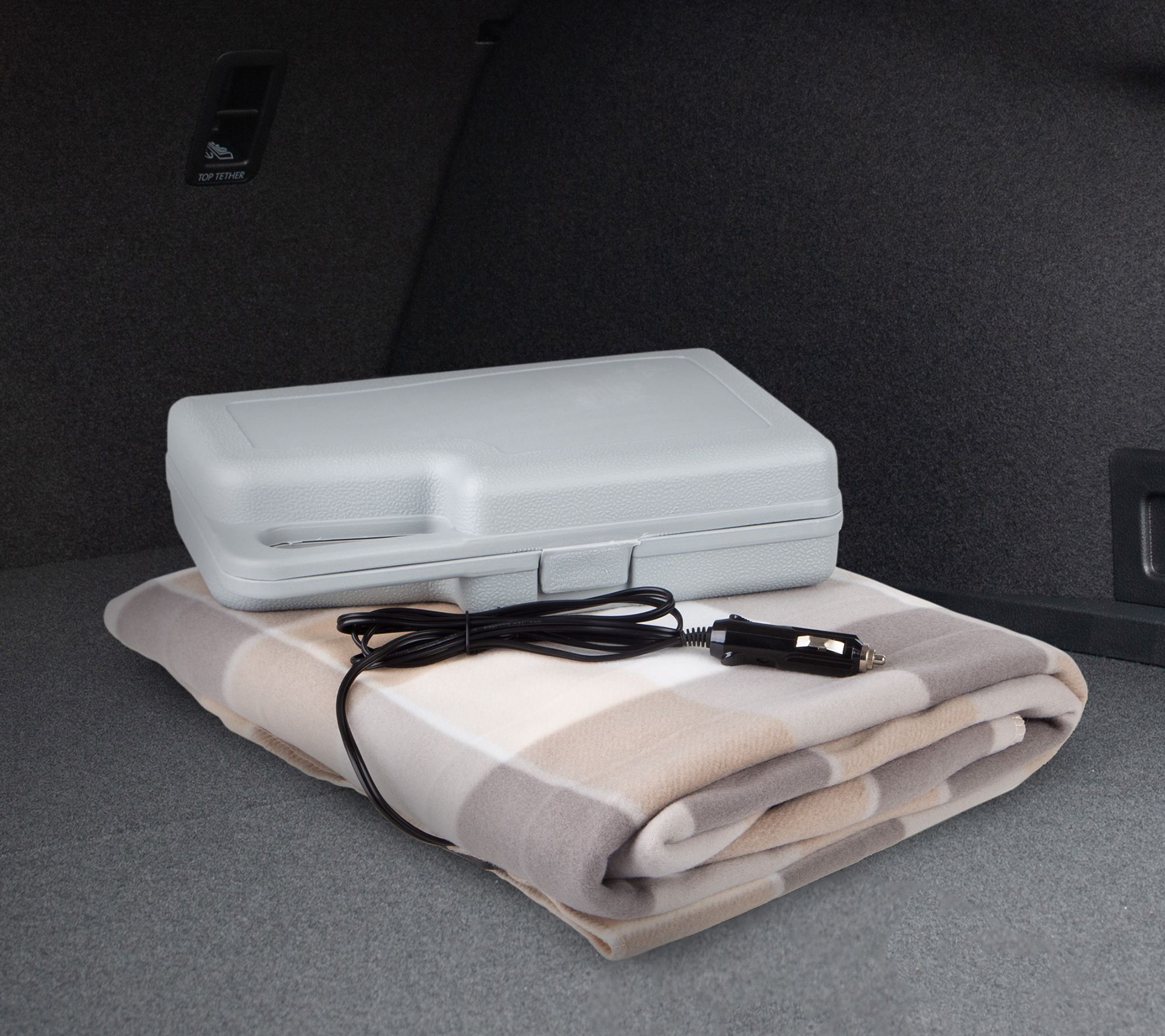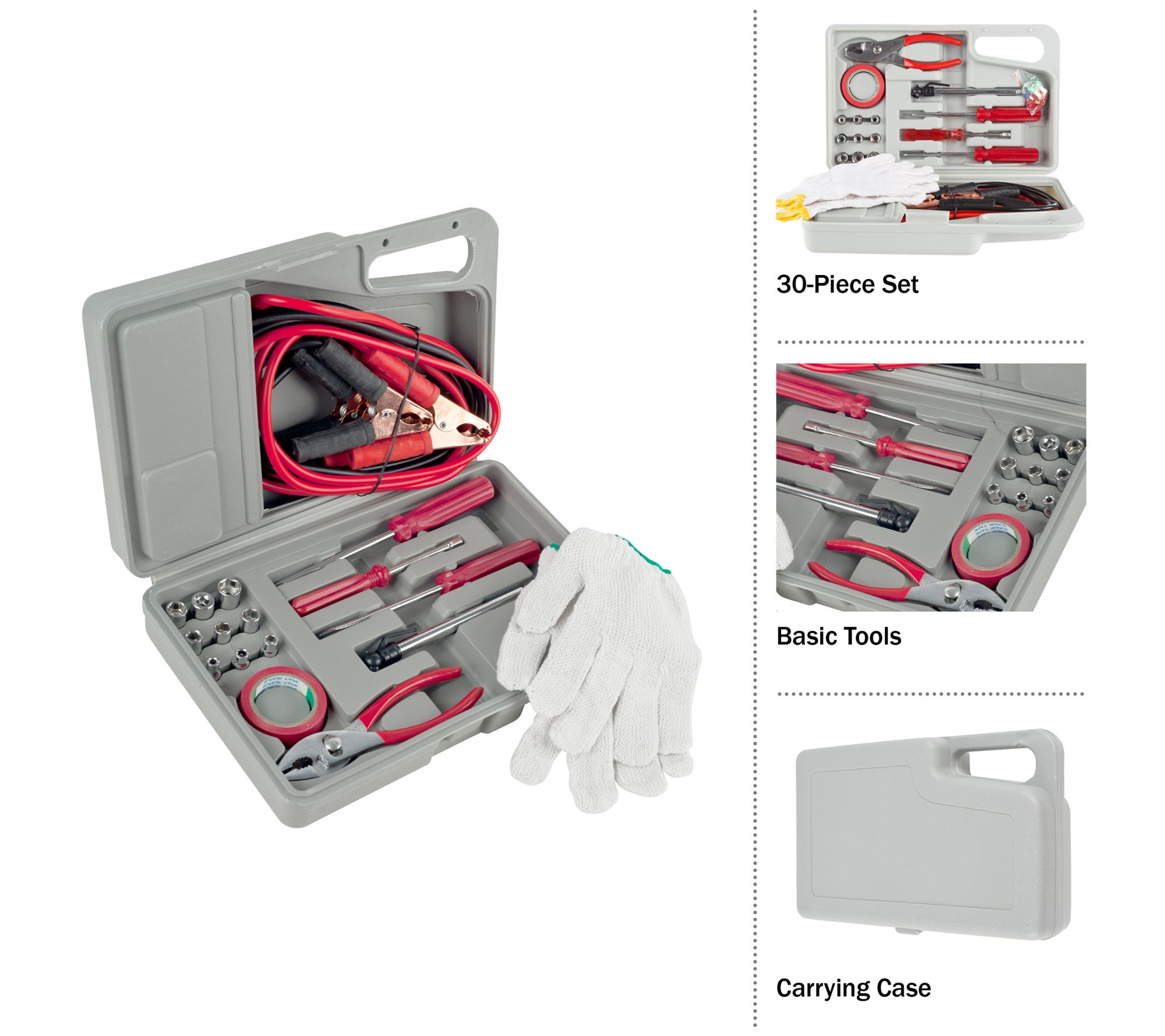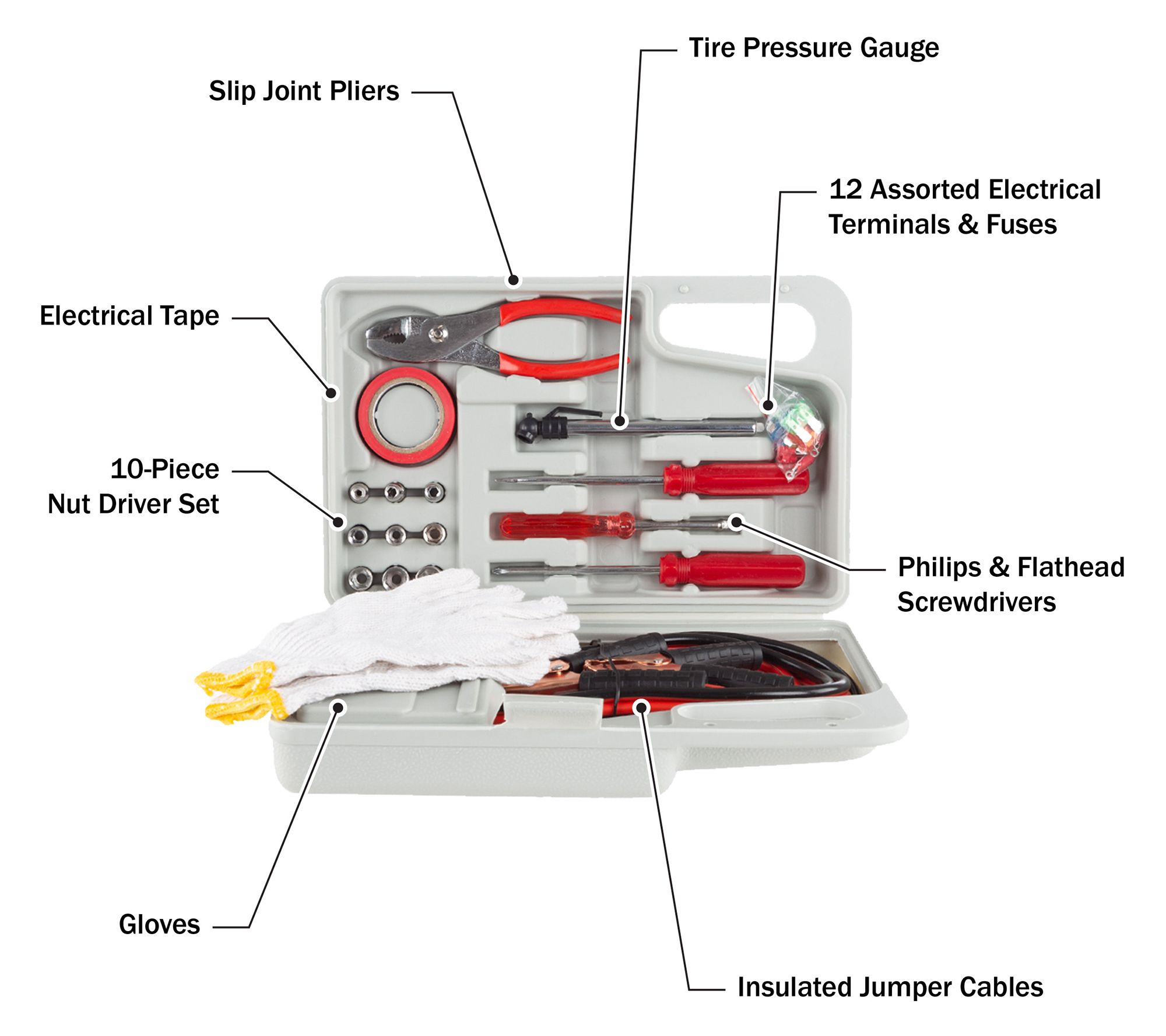 • Includes 12V heated blanket, jumper cables, gloves, tire pressure gauge, electrical tape, tool kit, and carrying case