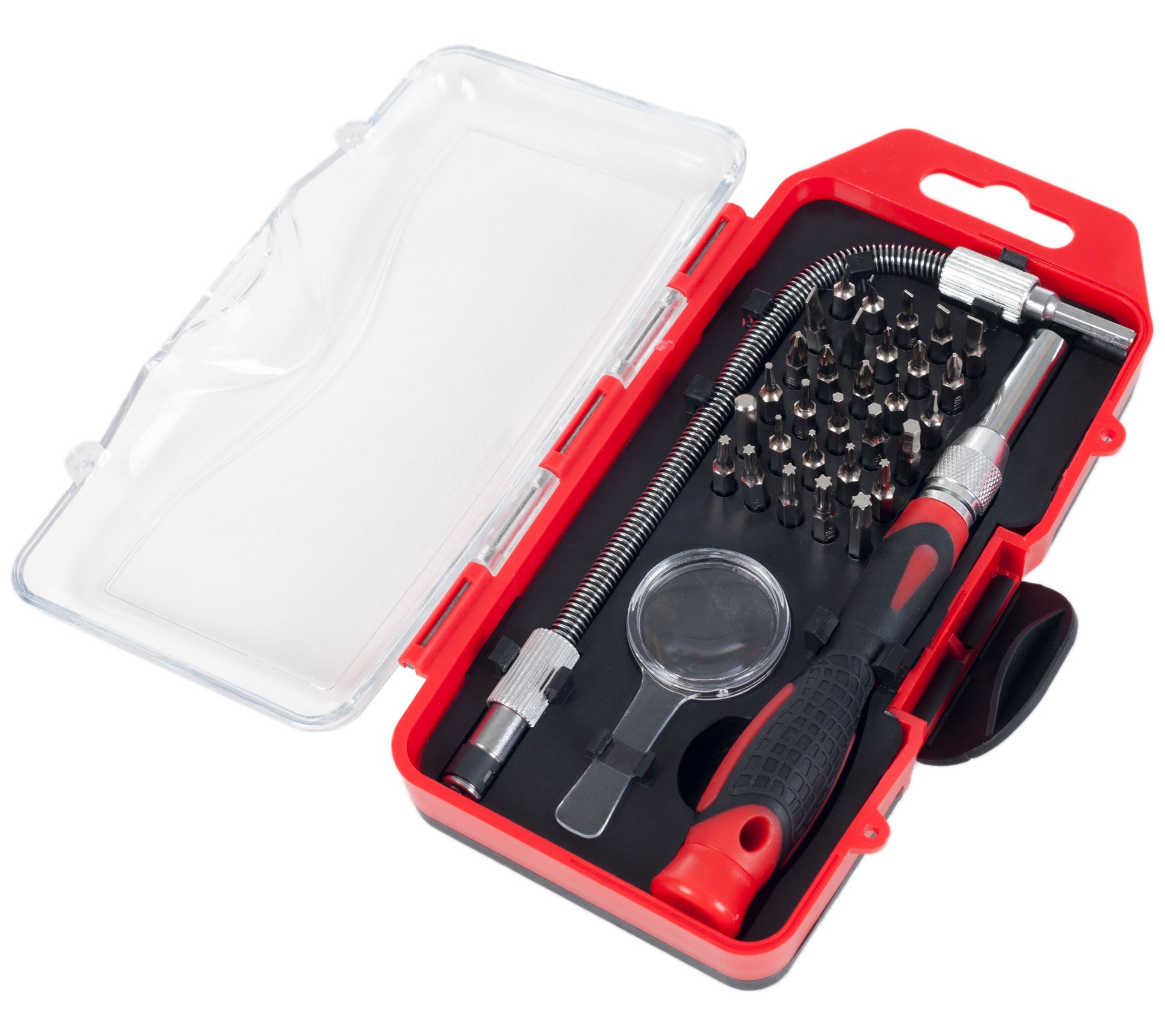 • Includes base, flex shaft, seven flat heads, six Phillips heads, 8 hex heads, 9 star heads, magnifying glass, and carry case