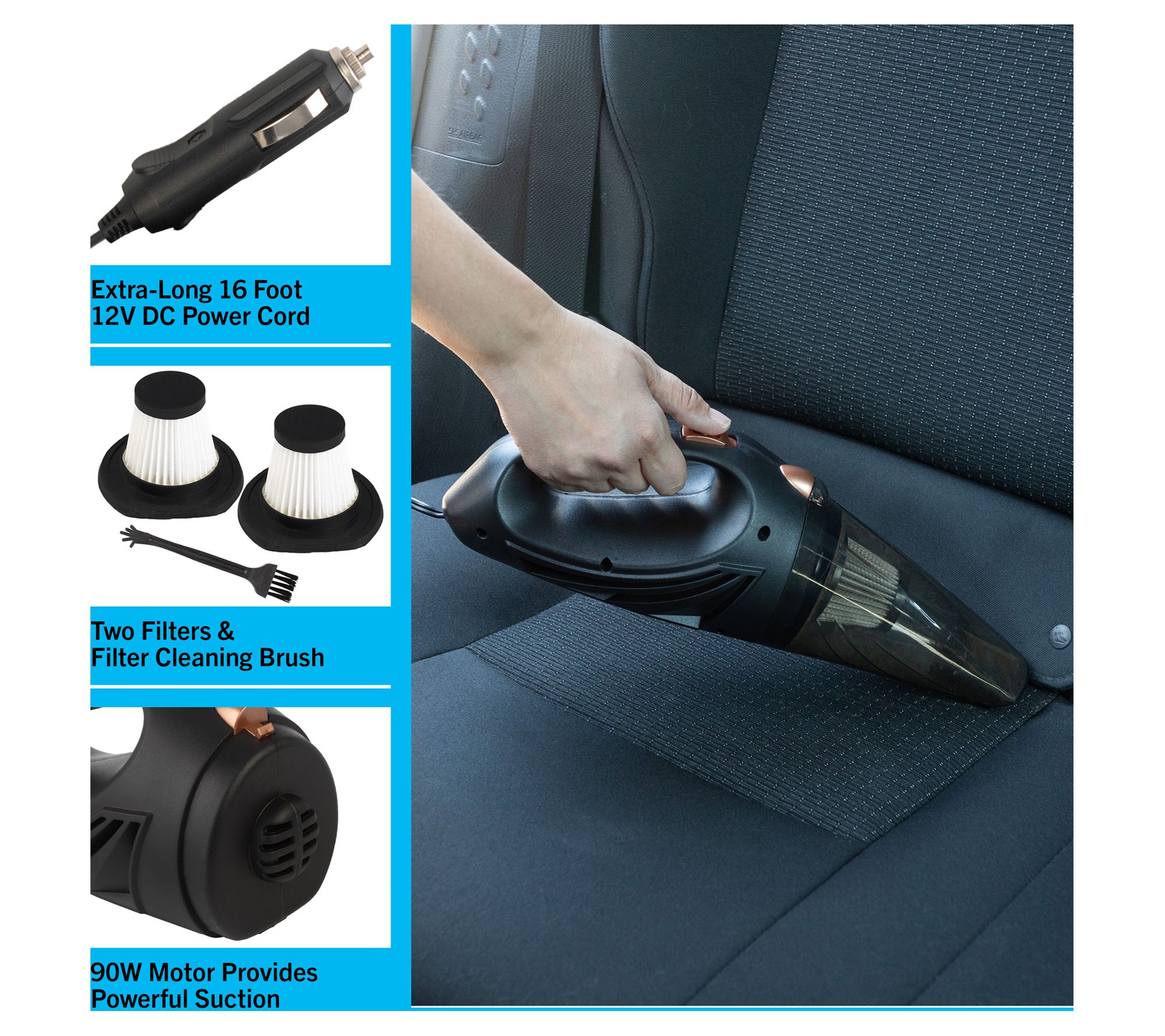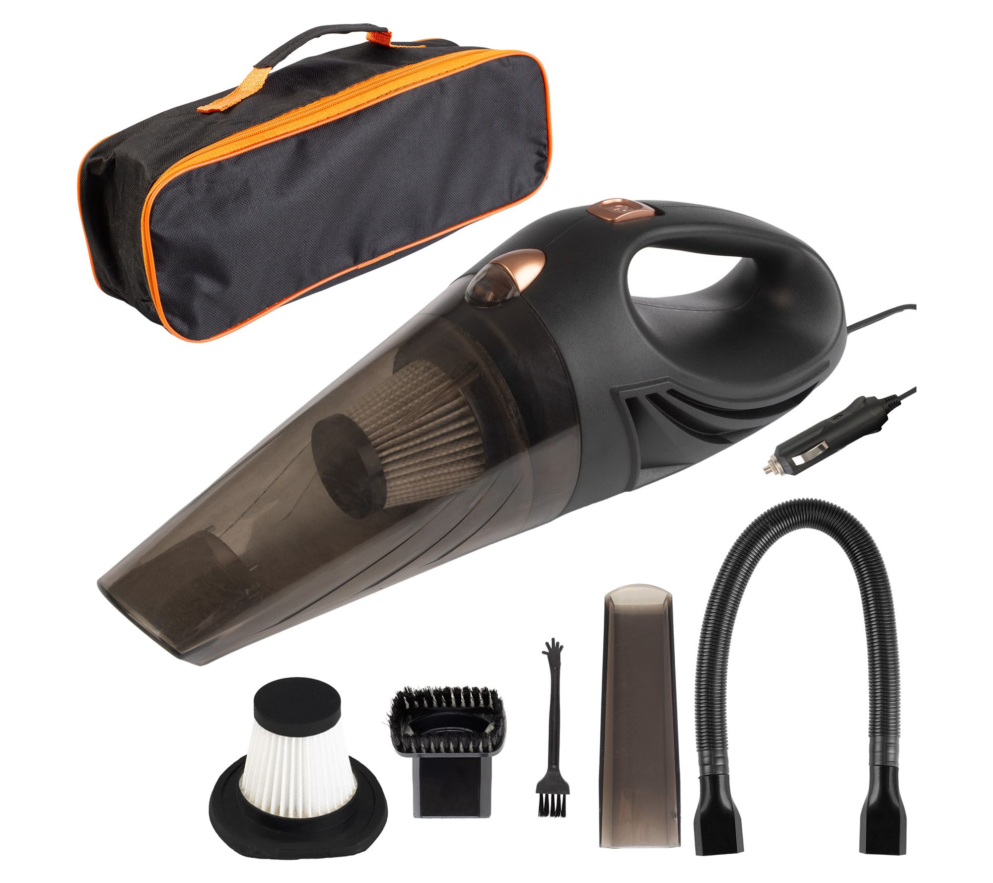 • Includes 12V handheld car vacuum with power cord, filter, upholstery brush, hose, carrying bag, crevice cleaner, filter cleaning brush, and manual