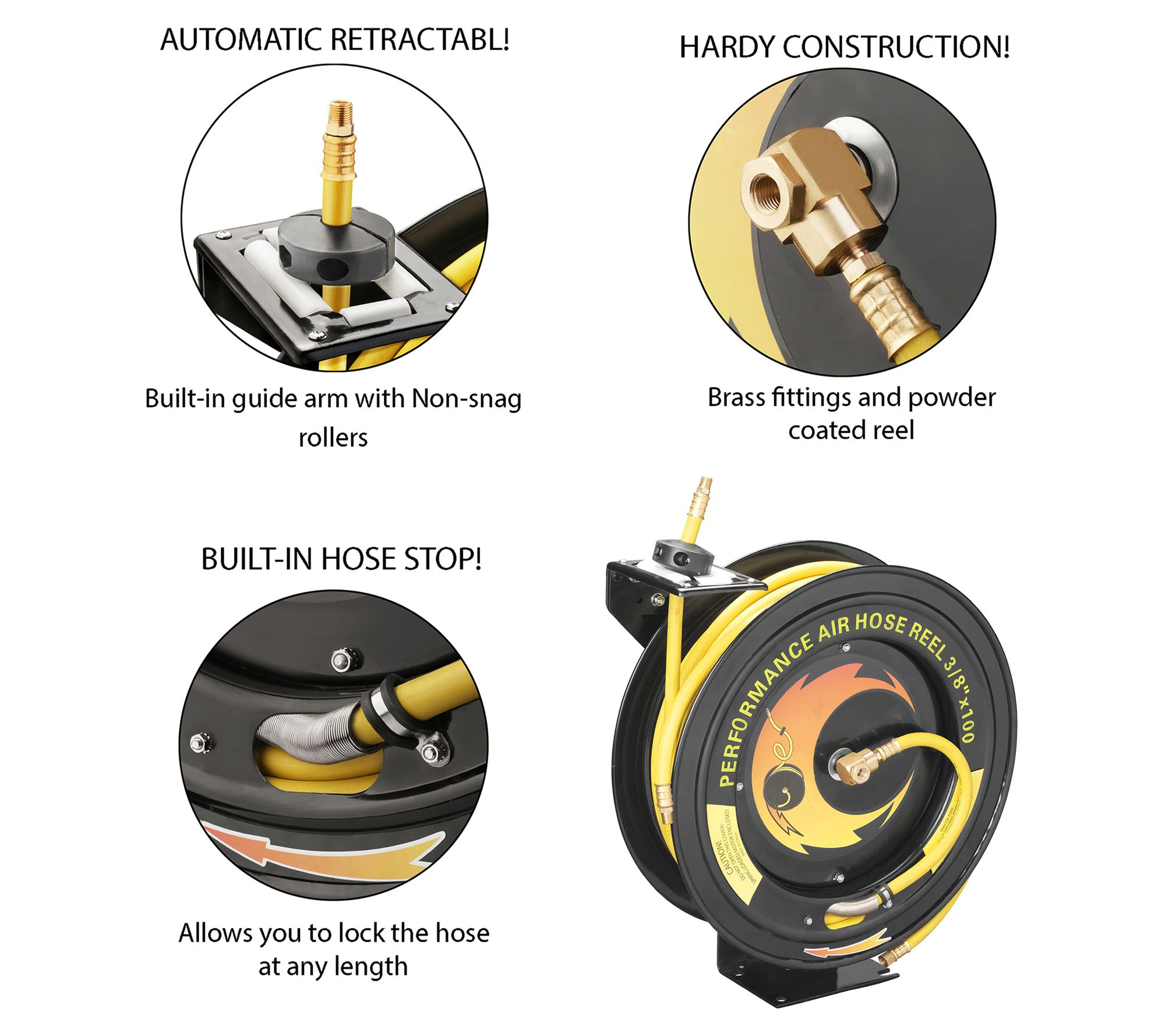 • Wide diameter reel prevents hose knots during retraction