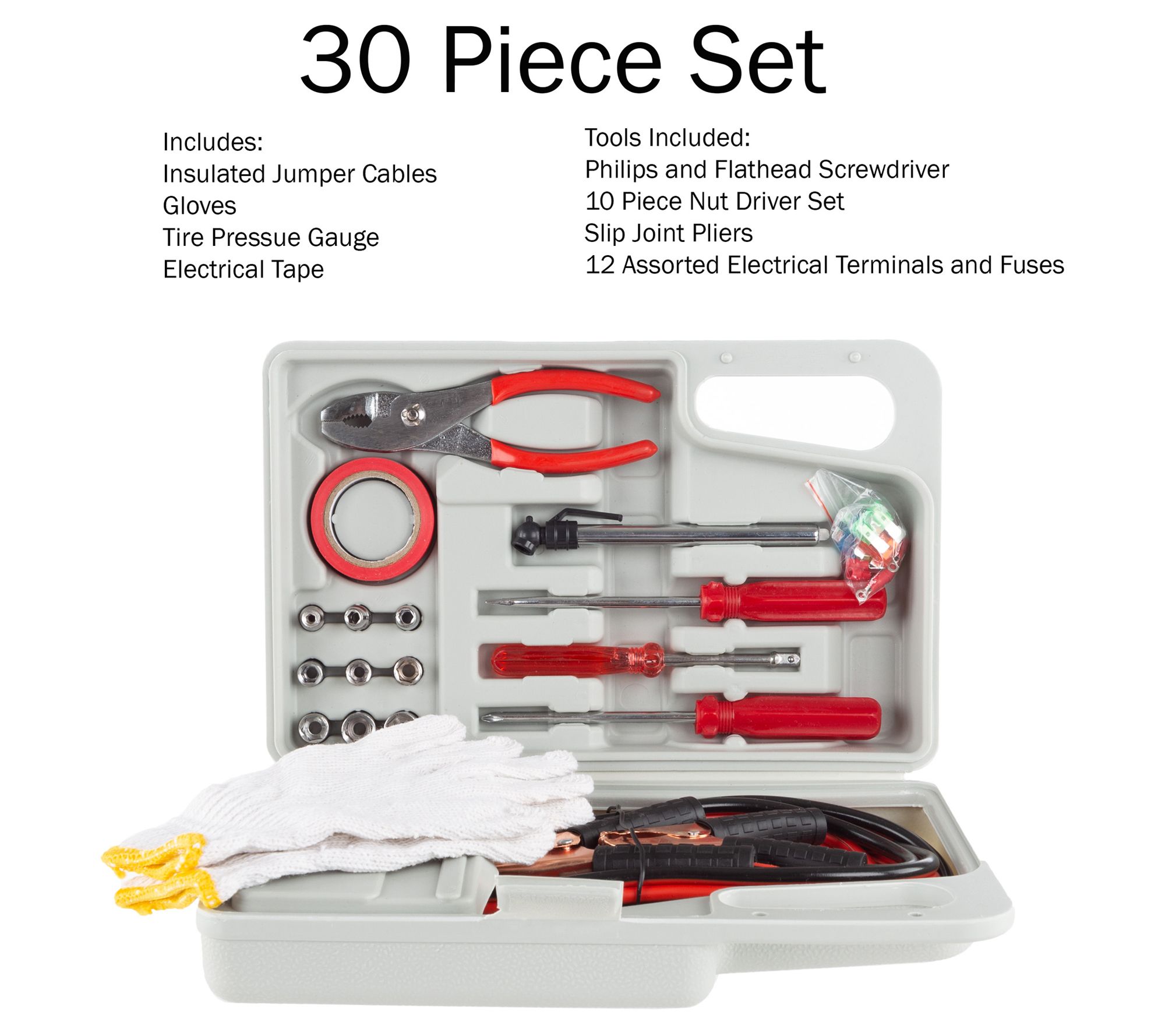 • 30-piece set includes insulated jumper cables, gloves, tire pressure gauge, flat and Phillips screwdrivers, 10-piece nut driver set, slip joint pliers, electrical tape, and assorted terminals and fuses