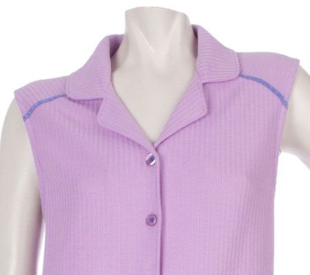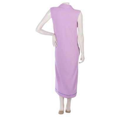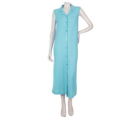 Don't call it a nightgown, this knit seersucker piece is perfect any time of day. Relaxation is ensured thanks to it sleeveless design, long length, and button-front closure. From Stan Herman.
