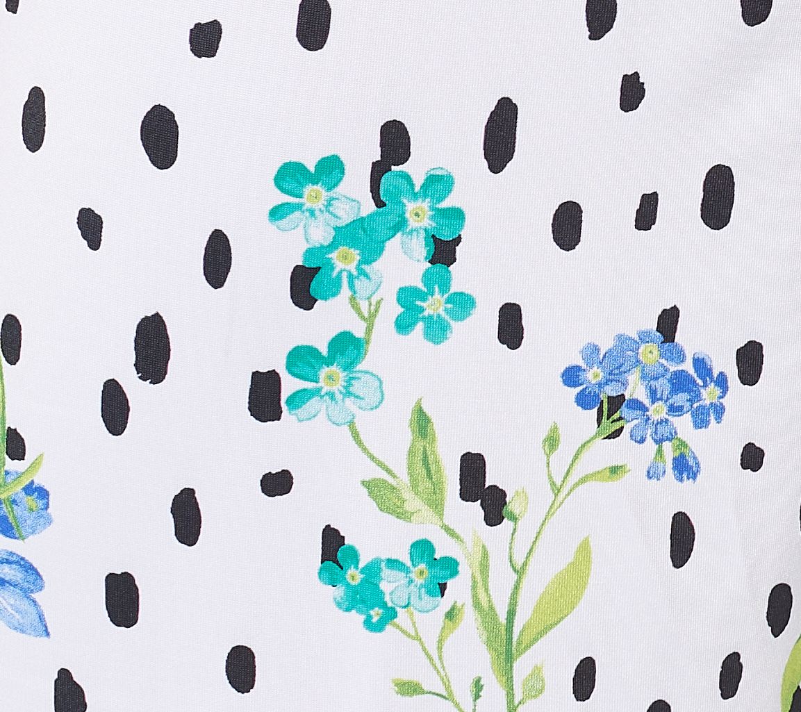 Top Features: V-neckline, twill tape at back neck, side slits at hem, short sleeves