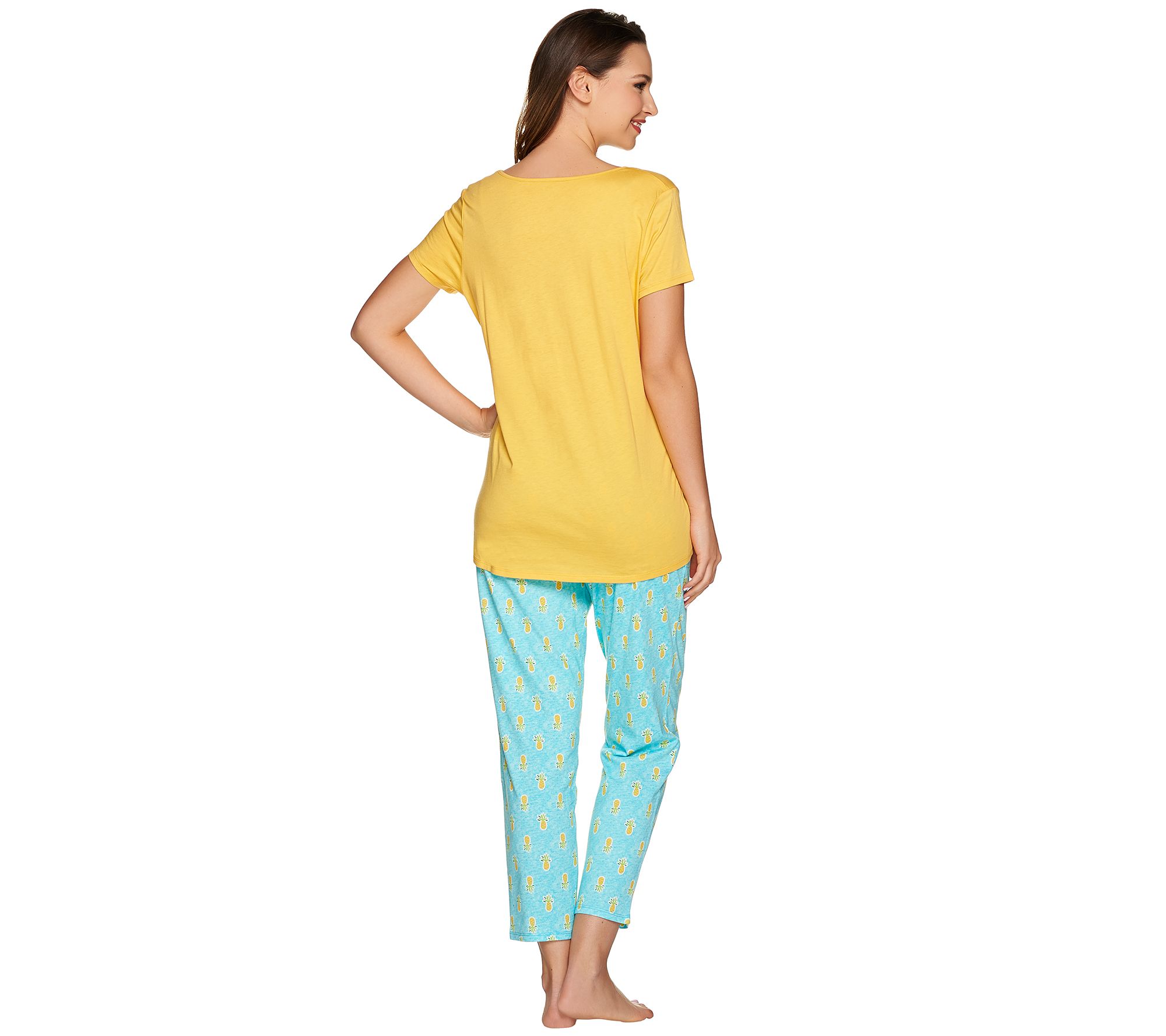Pajamas with personality. Settle in for sleep in Stan Herman's jersey pajama set. You'll love them for other traits as well--the long printed pants have side pockets and an easy-to-wear elastic waistband, and the solid top complements the look with a V-neckline and cap sleeves. From Stan Herman.