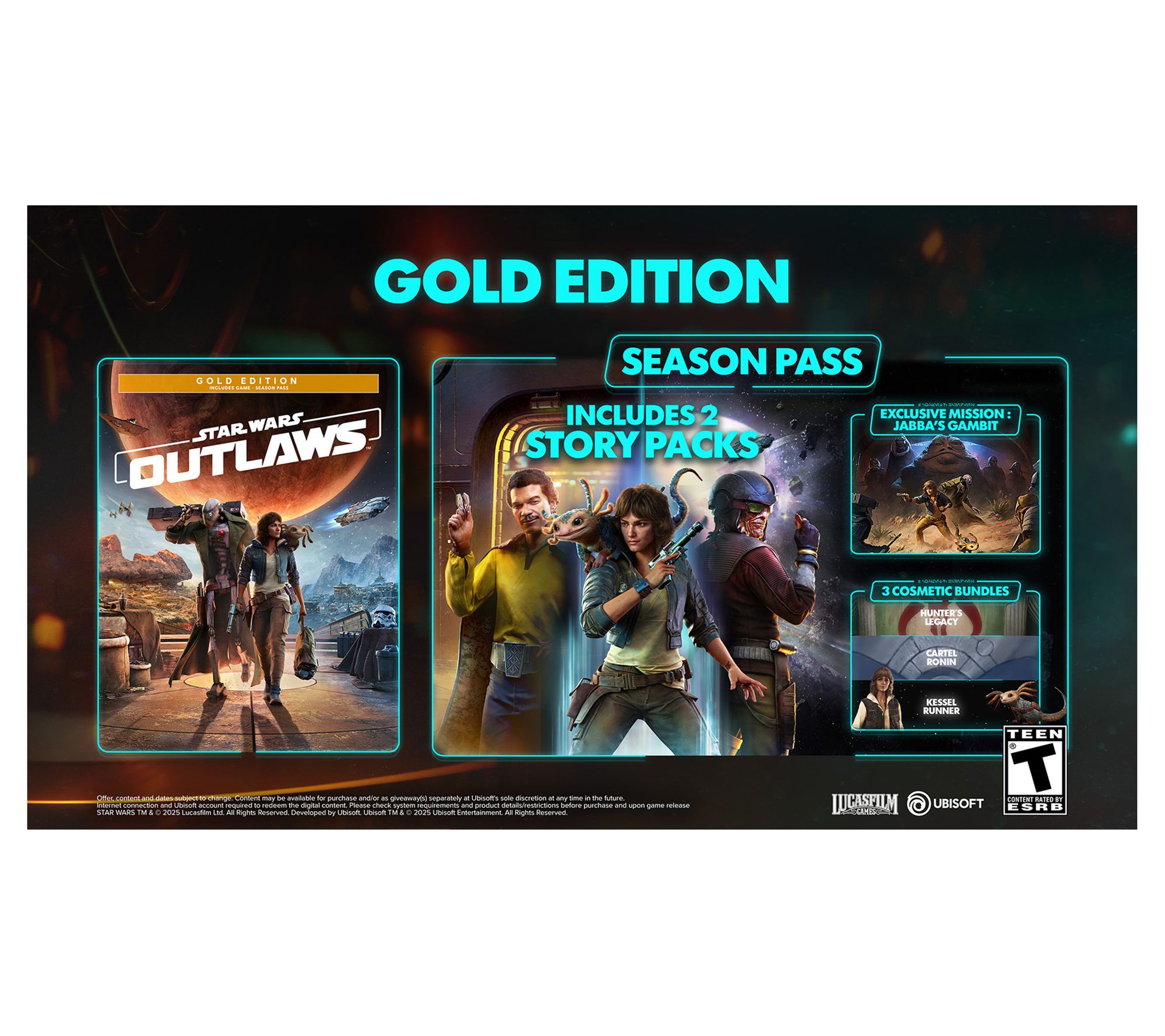 Star Wars: Outlaws Gold Edition for Nintendo Switch 2 lets you race across familiar and new worlds, making split-second decisions as Kay Vess to outsmart the galaxy's most dangerous syndicates. The Gold Edition includes not just the game, but a season pass packed with extra missions, story packs, and in-game bundles -- right at your fingertips for every daring escapade. The galaxy is yours to explore. Rated T. From Ubisoft.