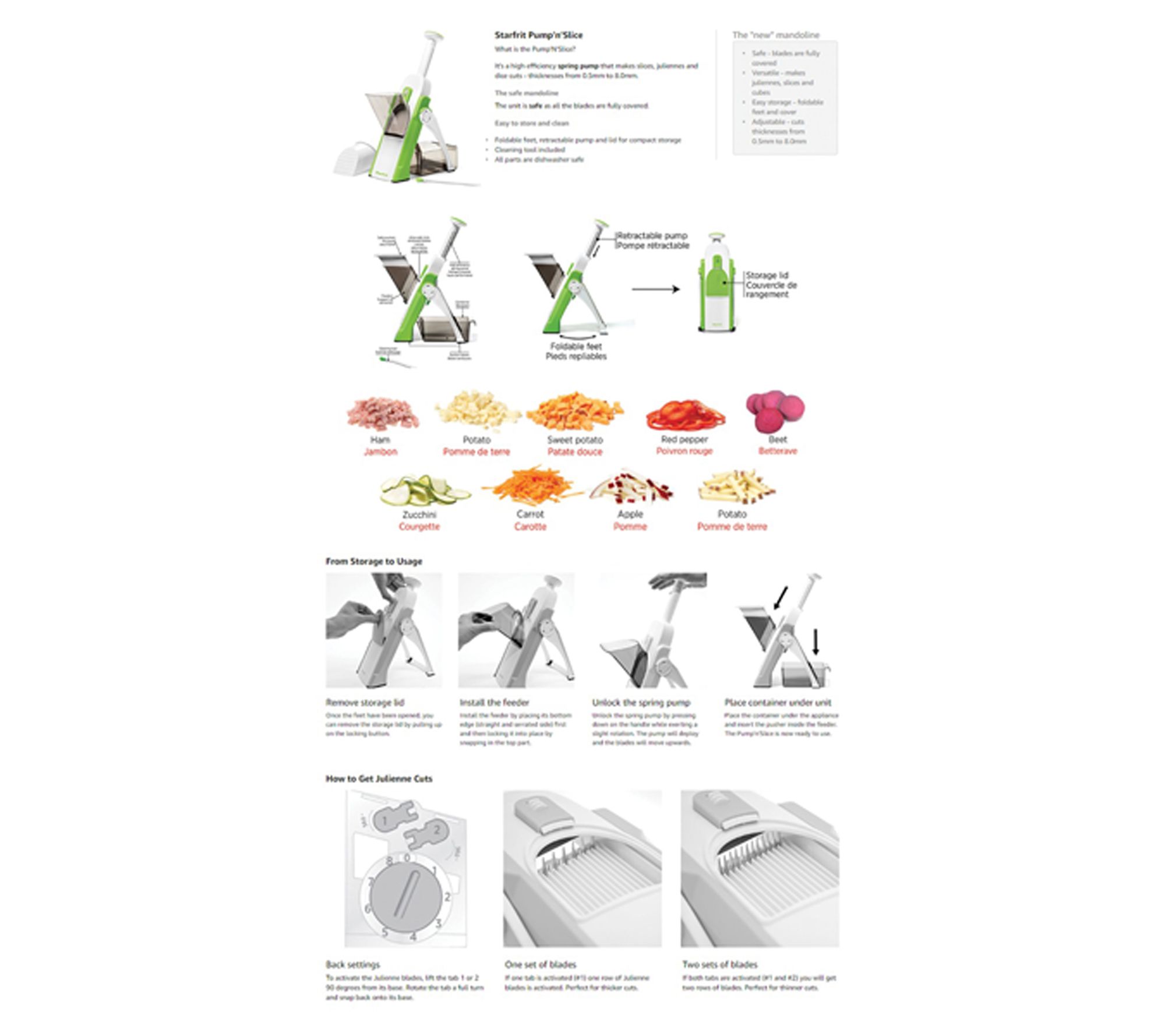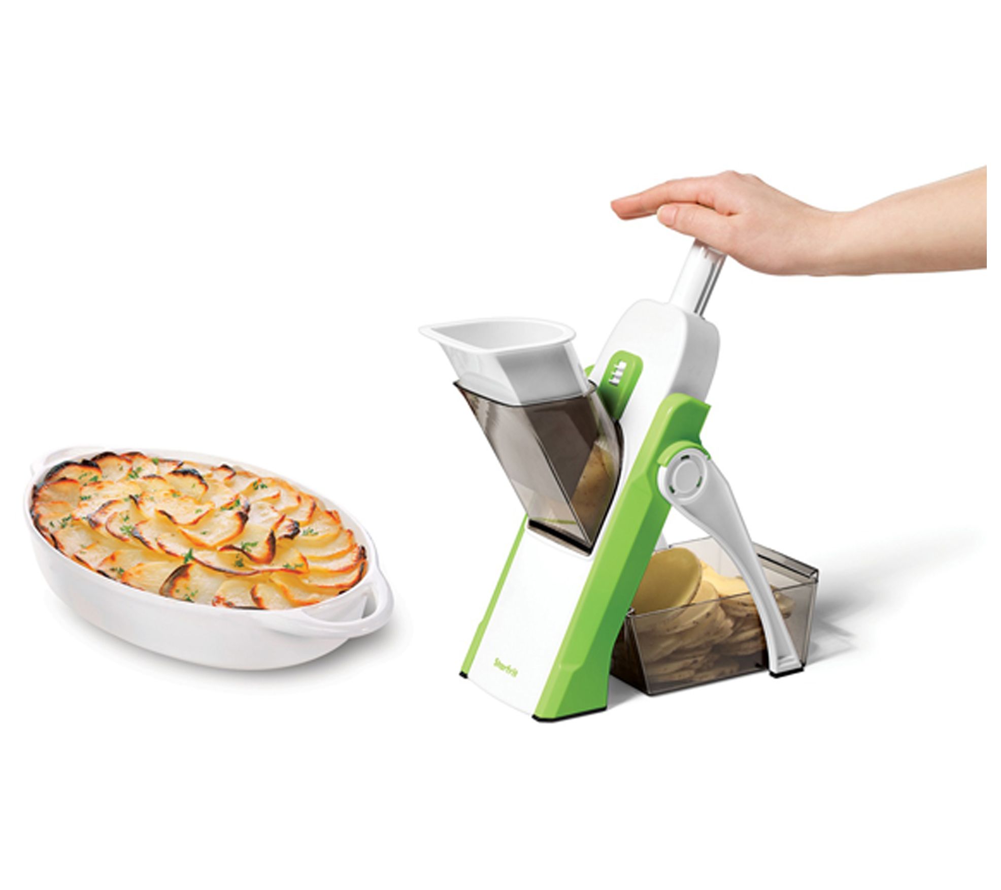 Fries, veggie platters, and fresh salads are all on the menu when you have this efficient slicer, featuring covered blades to keep fingers safe, and a spring pump that slices, juliennes, and dices with ease. From Starfrit.