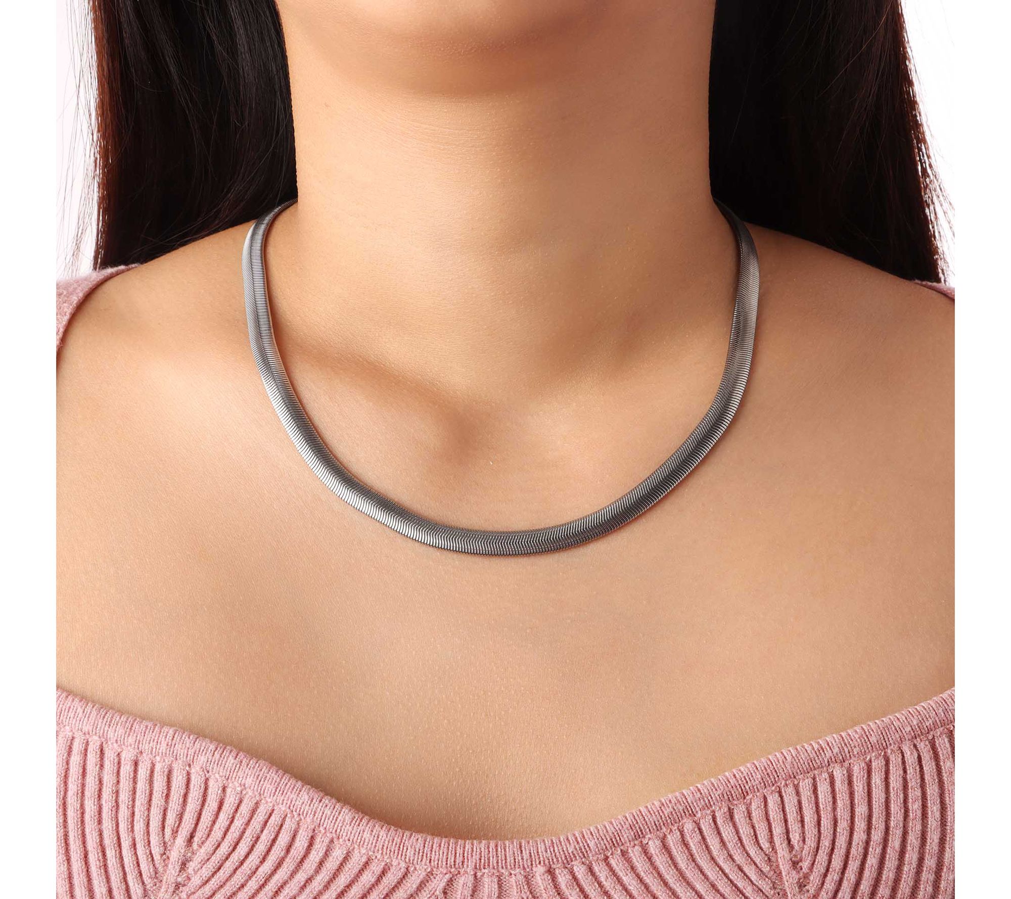 Elevate your style with the sleek elegance of this flat snake chain necklace. Its minimalist design highlights the uncompromising quality of stainless steel, making it a versatile addition to any jewelry collection. From Steel by Design Jewelry.