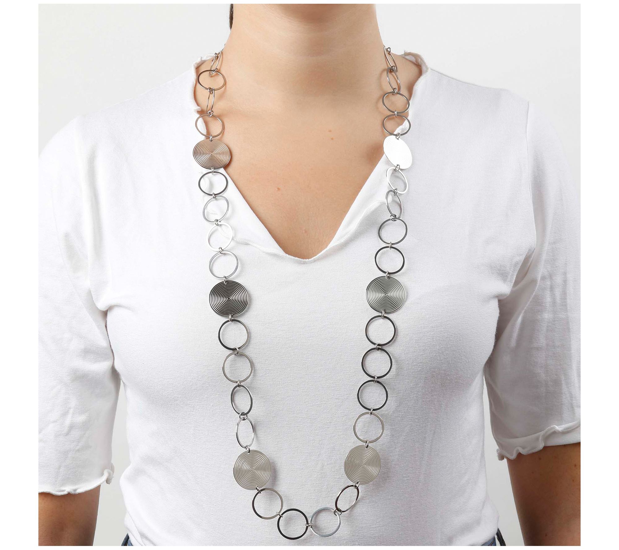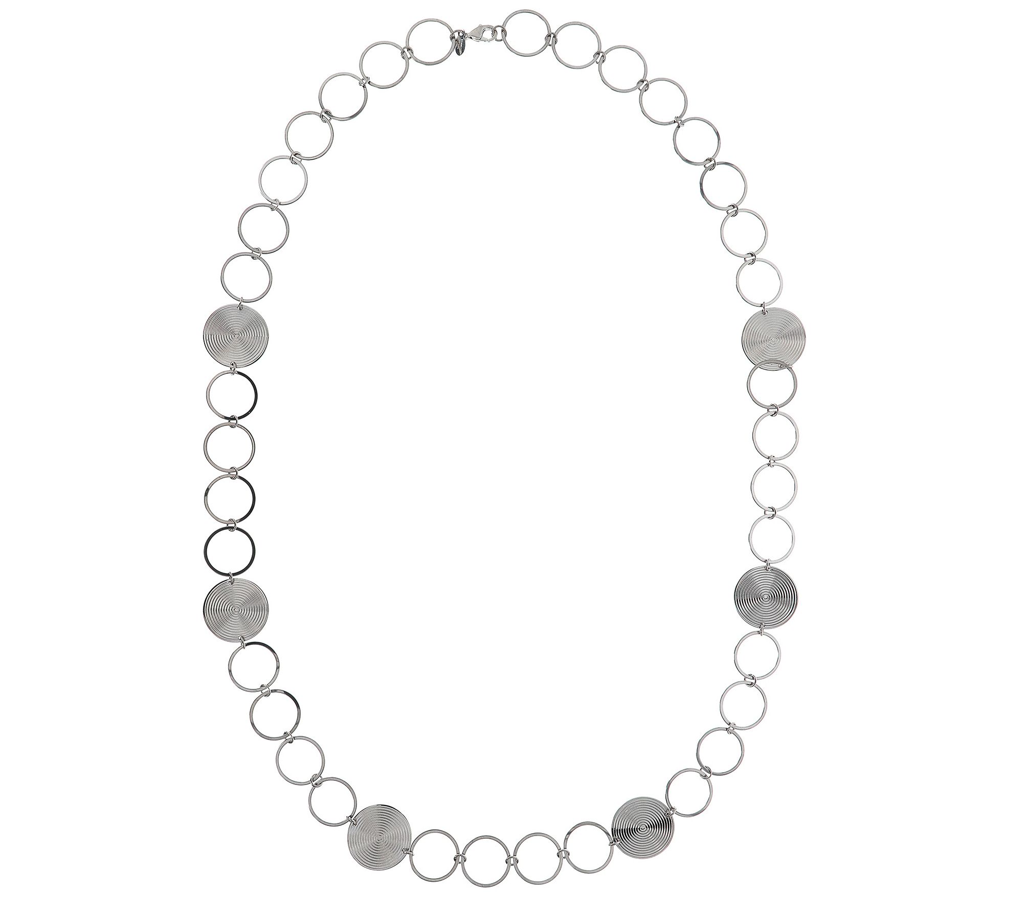 Slip on this modern necklace to complement your outfits with eye-catching circular links that scintillate in all directions. From Steel by Design.