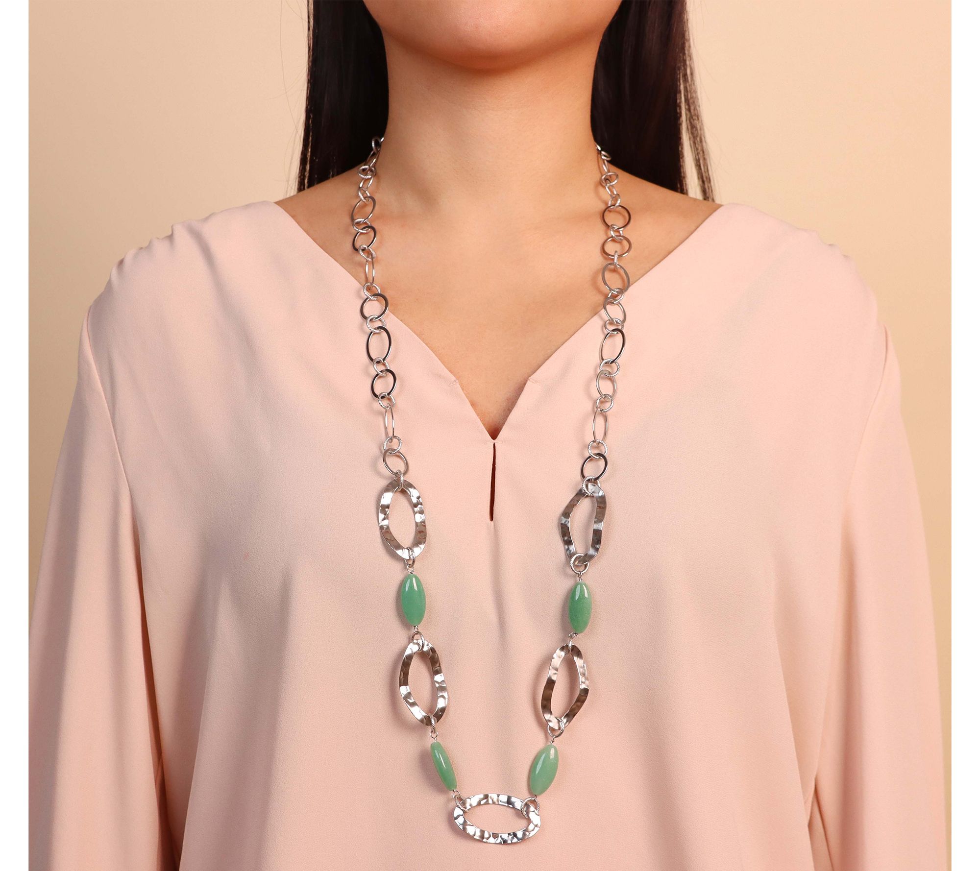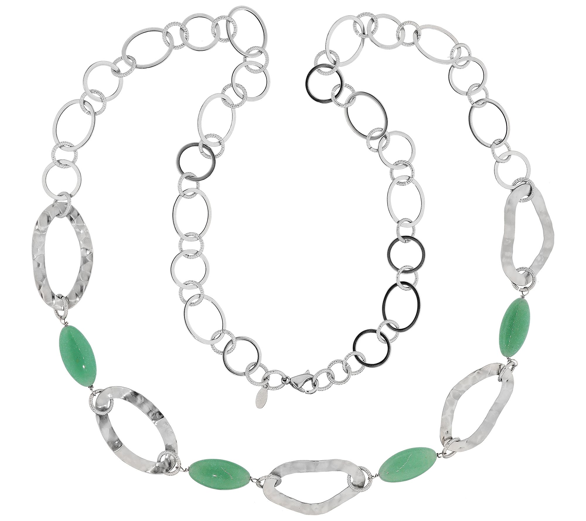 From Steel by Design comes this chic stainless steel necklace, featuring alternating polished and textured links with green aventurine gemstone stations in the frontal design. Ideal for any occasion, this piece offers a versatile length that complements a variety of outfits. From Steel By Design.