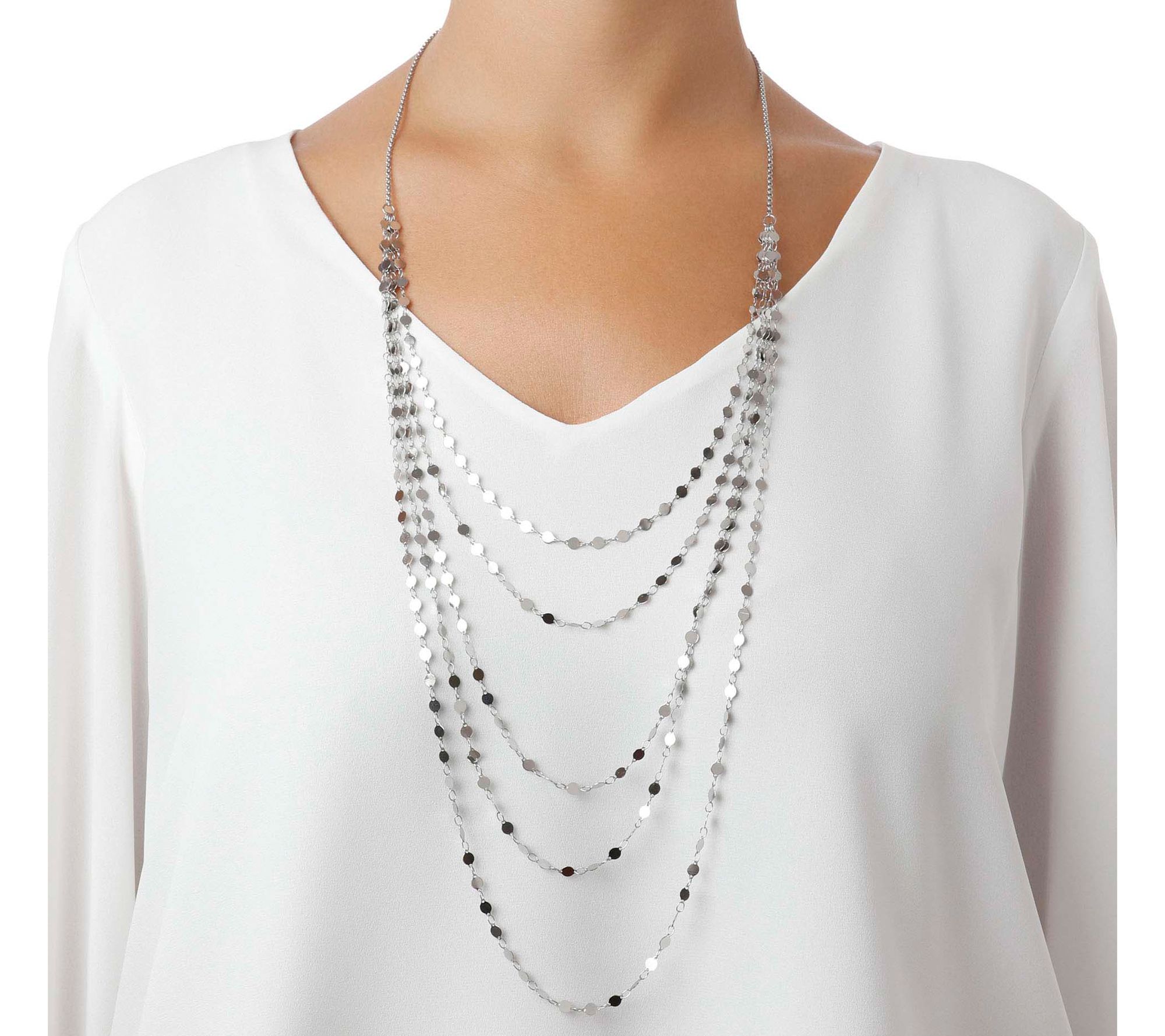 • Multi-strand necklace with flat, and round disc on graduated strand; polished finish
