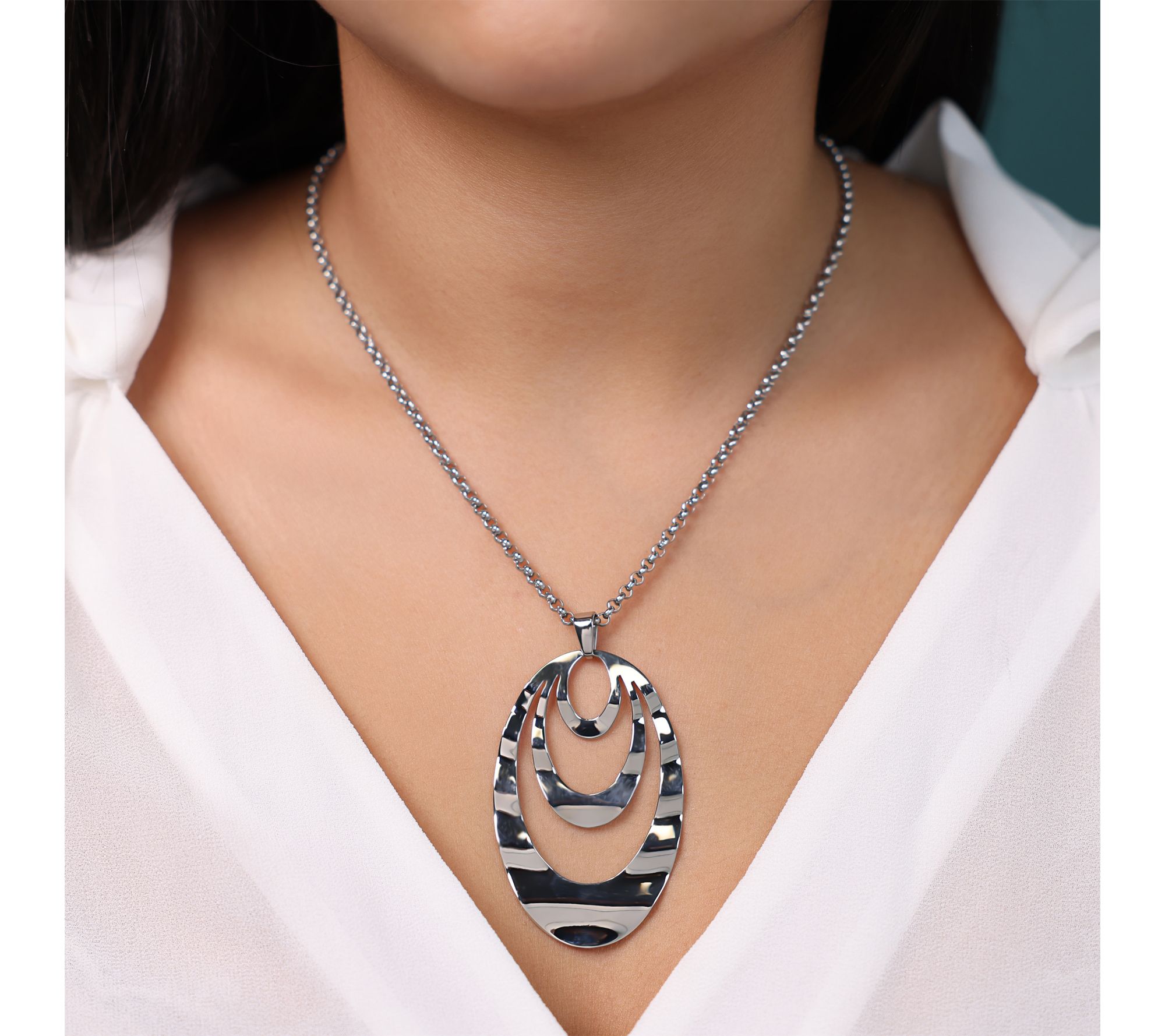 • Graduated oval-shapaed wave pendant; distinctive finish; attached to oval rolo chain