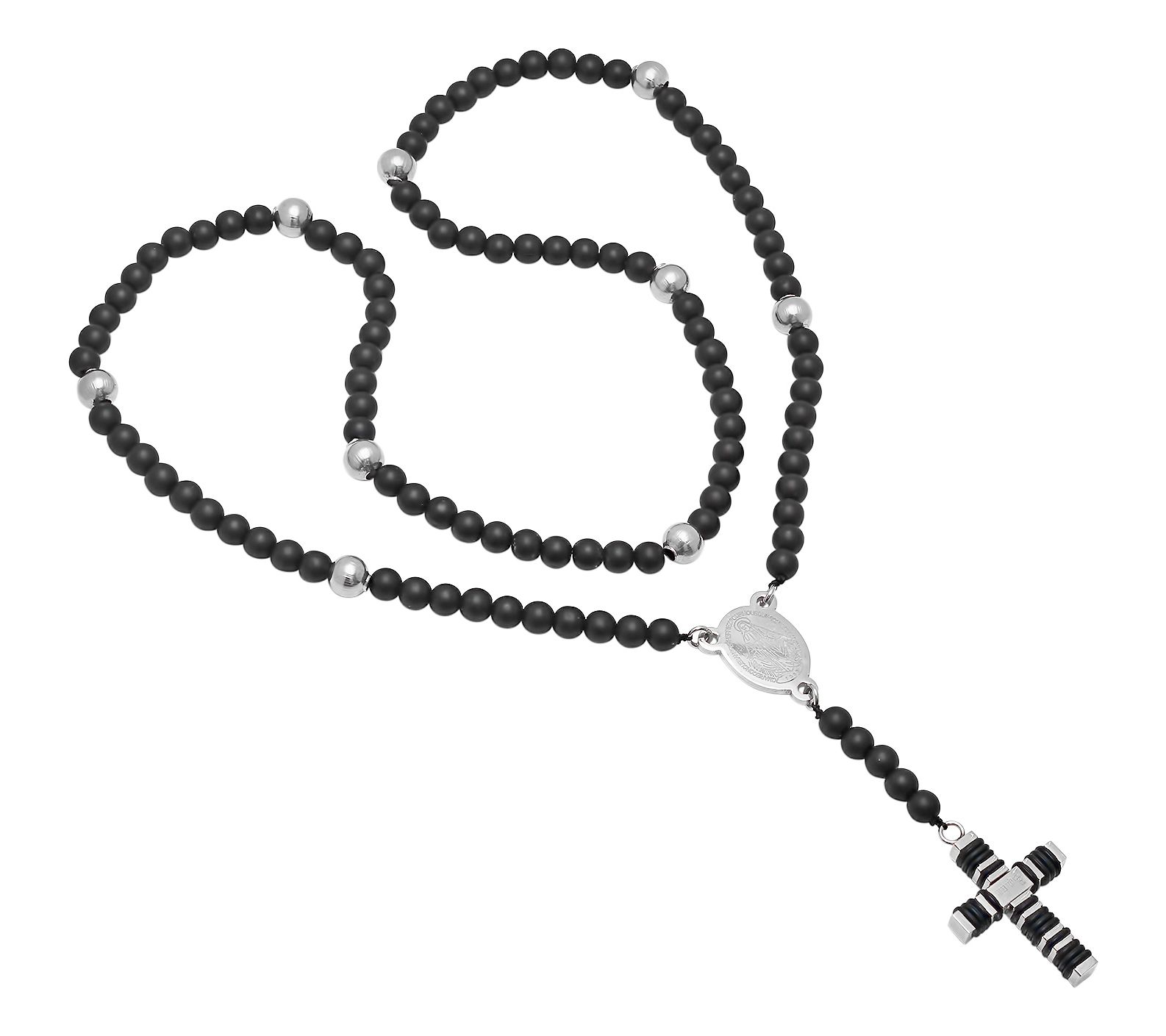 A stylish way to celebrate your faith, this striking black lava bead rosary necklace gives a modern update to a traditional design. From Steel by Design.
