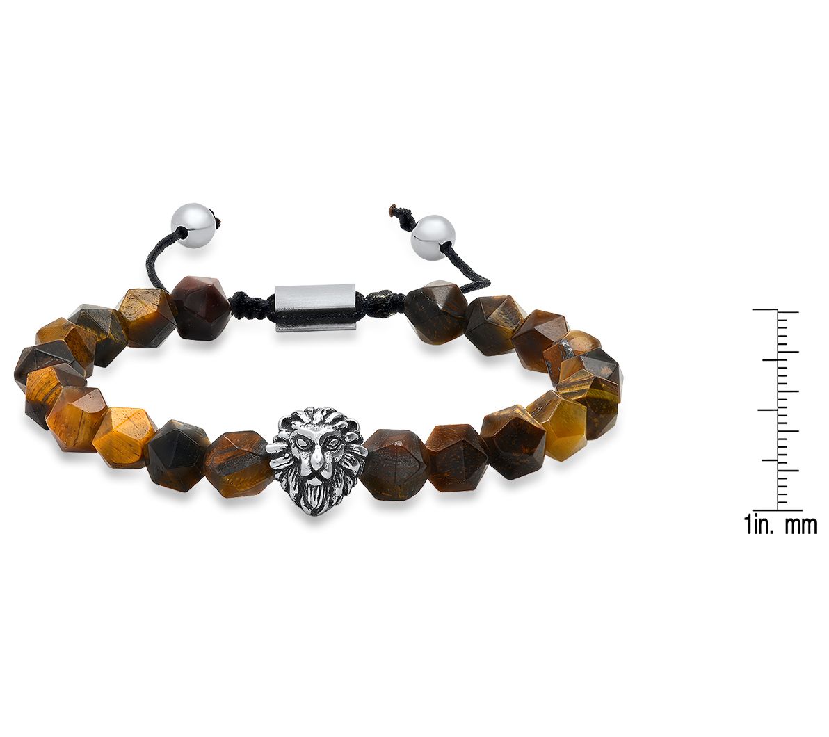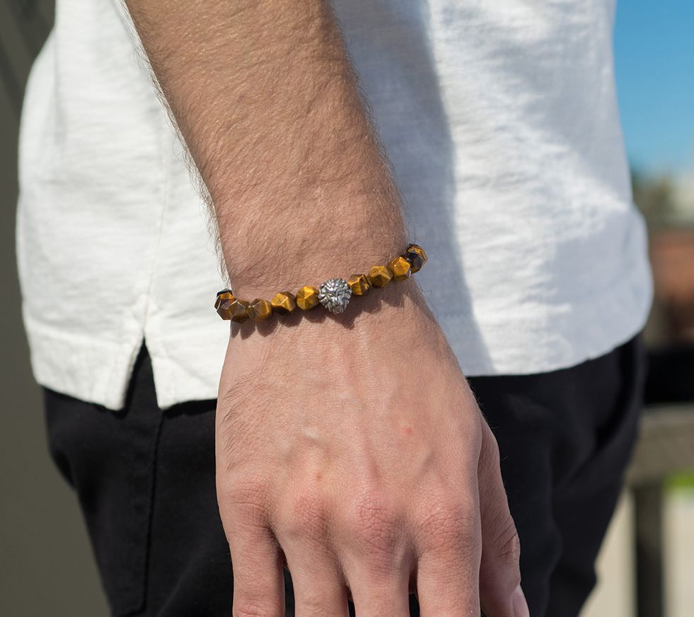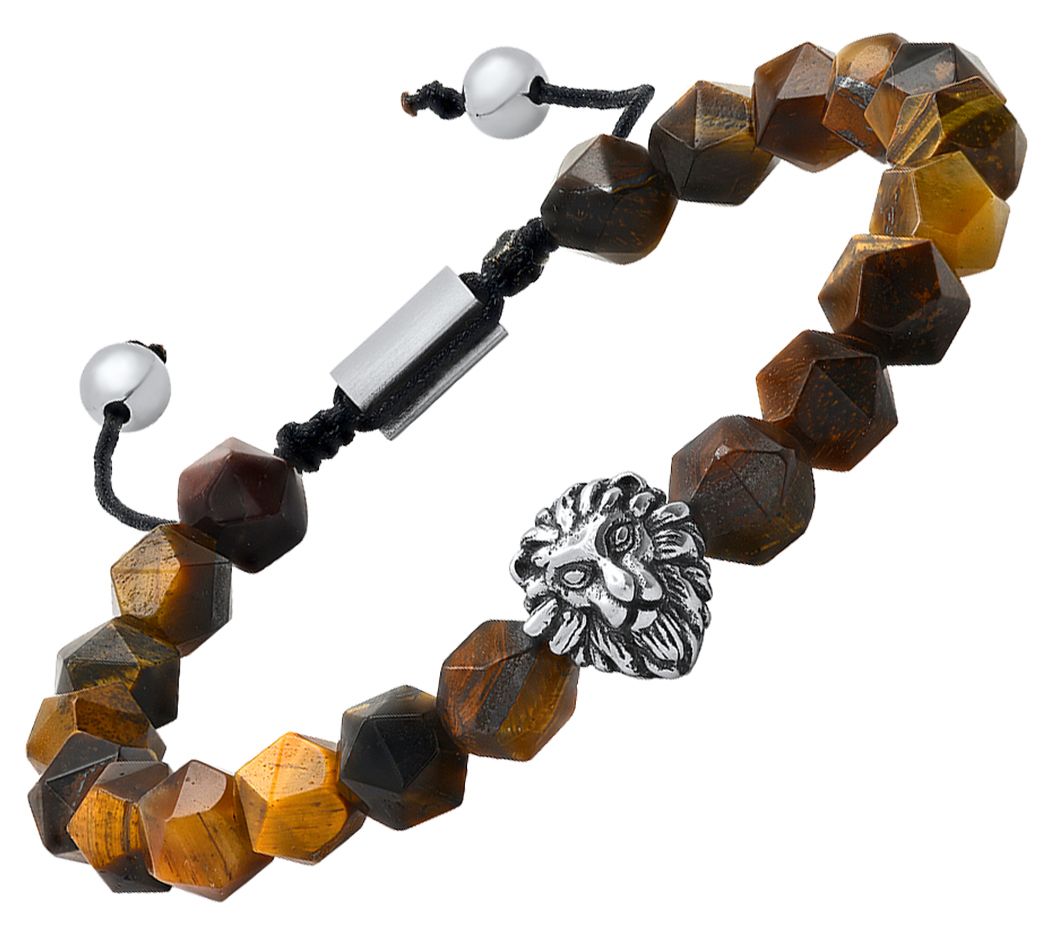 • Slip-on style; tiger's eye beads or black beads throughout; lion's head charm