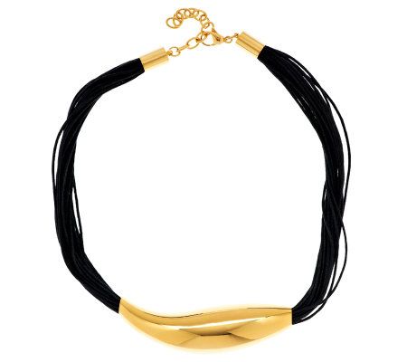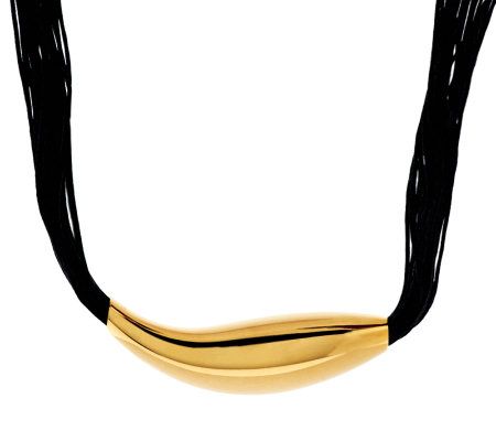 • Irregular, bold, barrel-shaped sliding pendant on black multi-strand cord necklace; highly polished endcaps