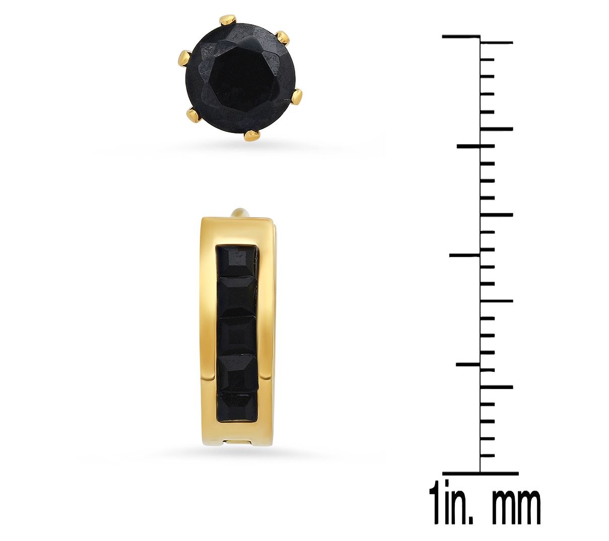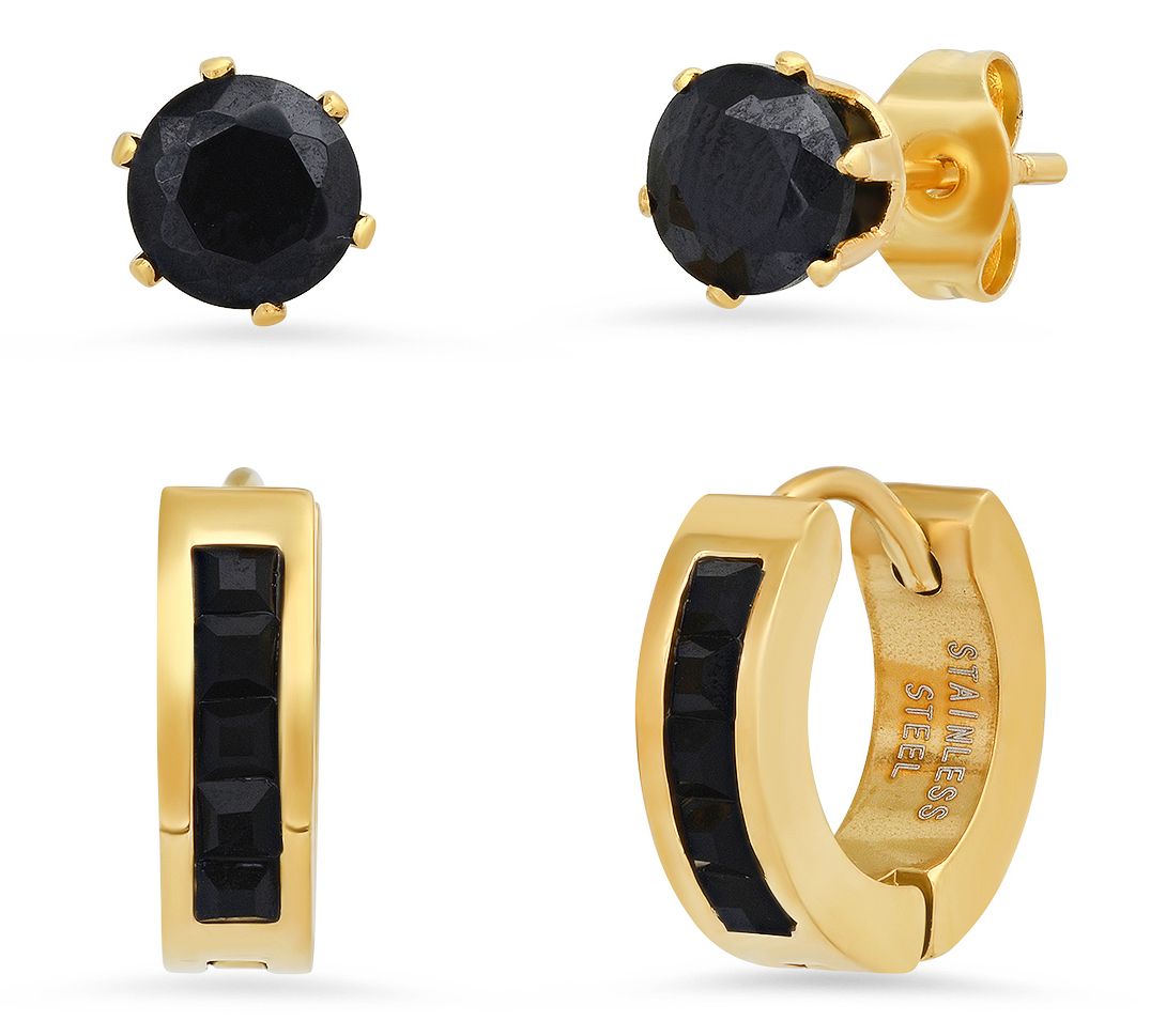 Discover the perfect blend of elegance and versatility with this 18K gold-plated stainless steel and black cubic zirconia earring set. This stunning duo, featuring both stud and huggie hoop designs, offers sparkling options for every occasion. From Steel by Design.