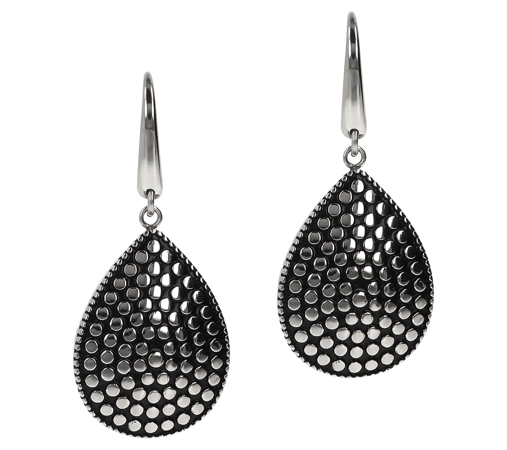 Elevate your style with these captivating teardrop earrings from Steel by Design. The textured design, complemented by black enamel with a dotted pattern, adds a touch of sophistication to any outfit. From Steel by Design.