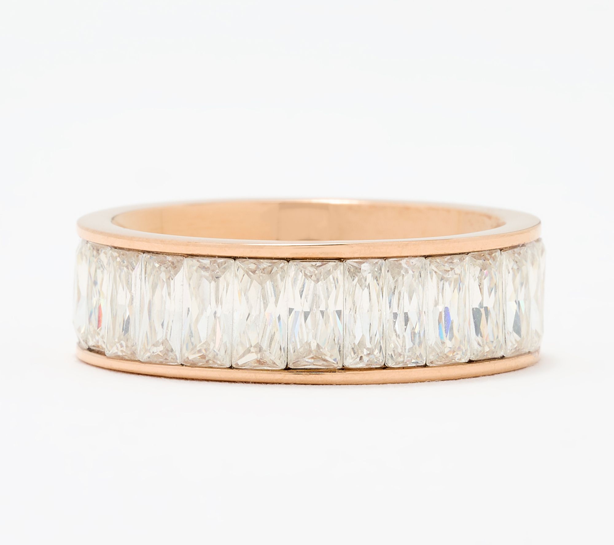 Forever and ever. With a classic eternity design that's easy to stack or wear solo, this sparkly baguette -cut ring is the accessory that always seems to work. Grab it for yourself or gift it -- the fluid, high-shine style is a superb reflection of your commitment to someone or something (like that passion project you've embarked on)!