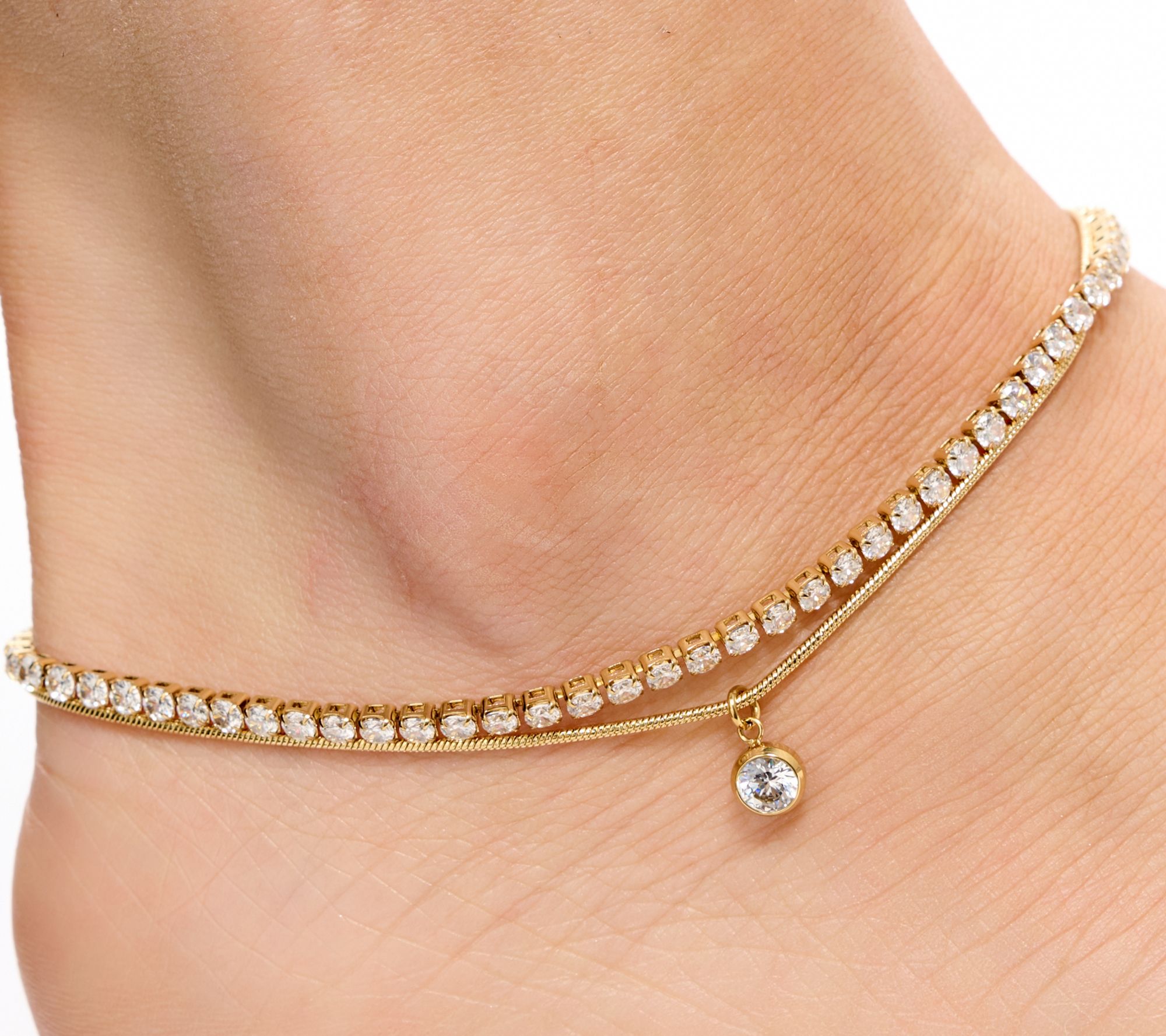 Don't just walk on by! Add a sparkling accent to sandals or sneakers with this tennis anklet, featuring a line of round, clear Diamonique simulated diamonds. Polished stainless steel offers a modern look that seamlessly transitions from poolside afternoons to evening outings.