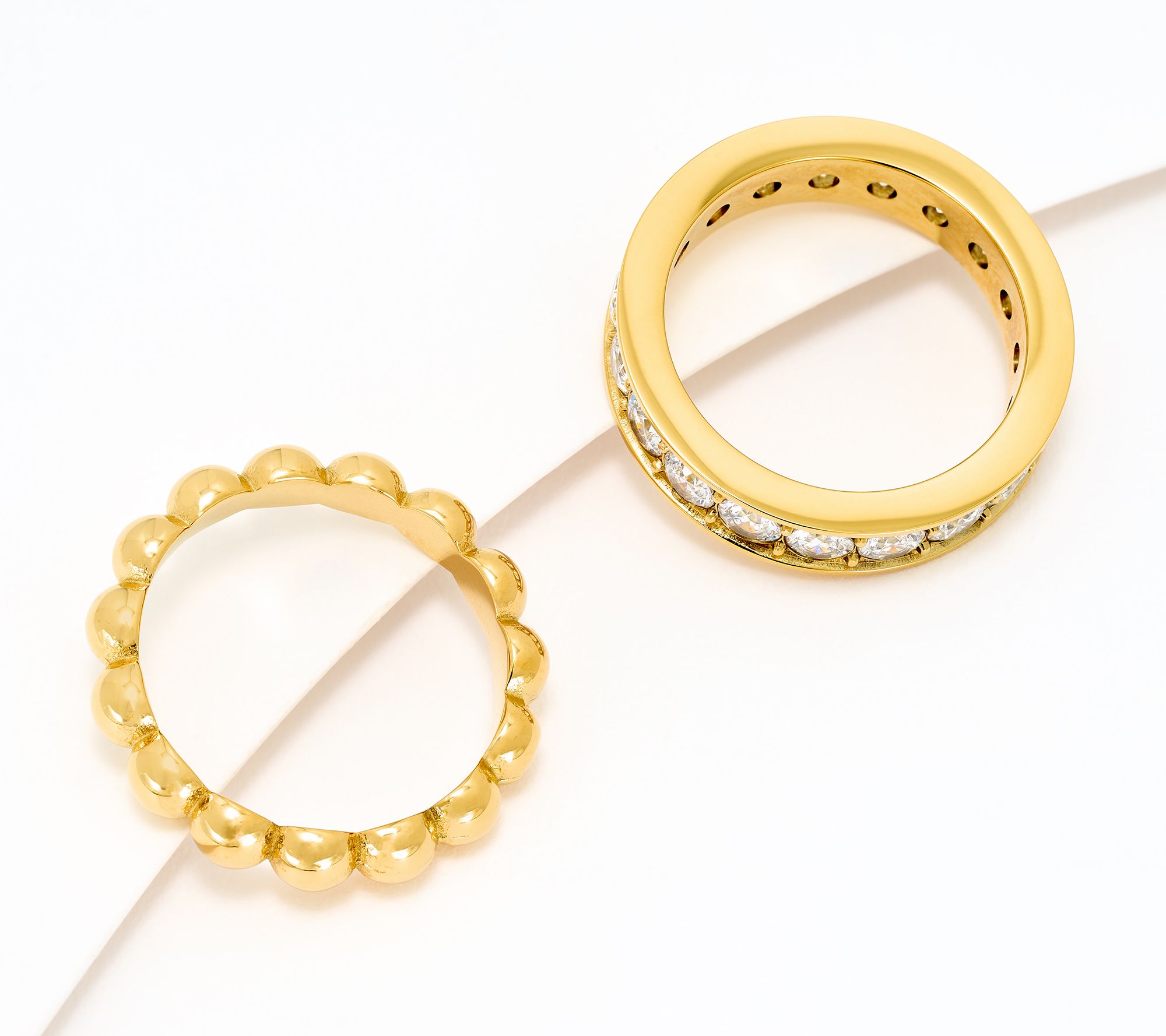 Stack, mix, or share -- this set of two band rings lets you customize your sparkle every day. One polished band and one eternity ring with Diamonique simulated diamonds create endless style possibilities, whether layered together or worn solo for a sleek finishing touch.