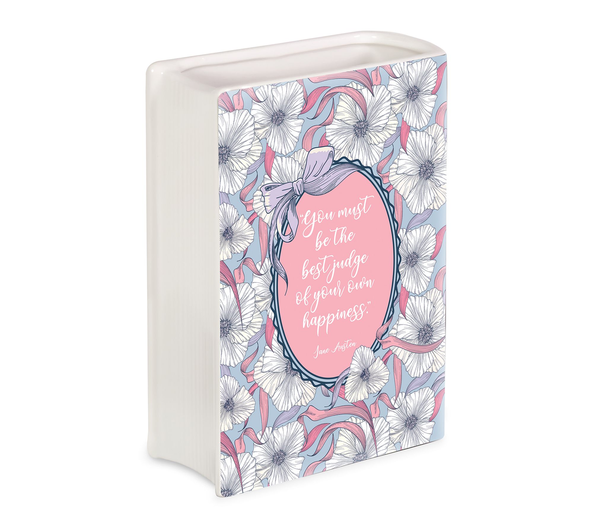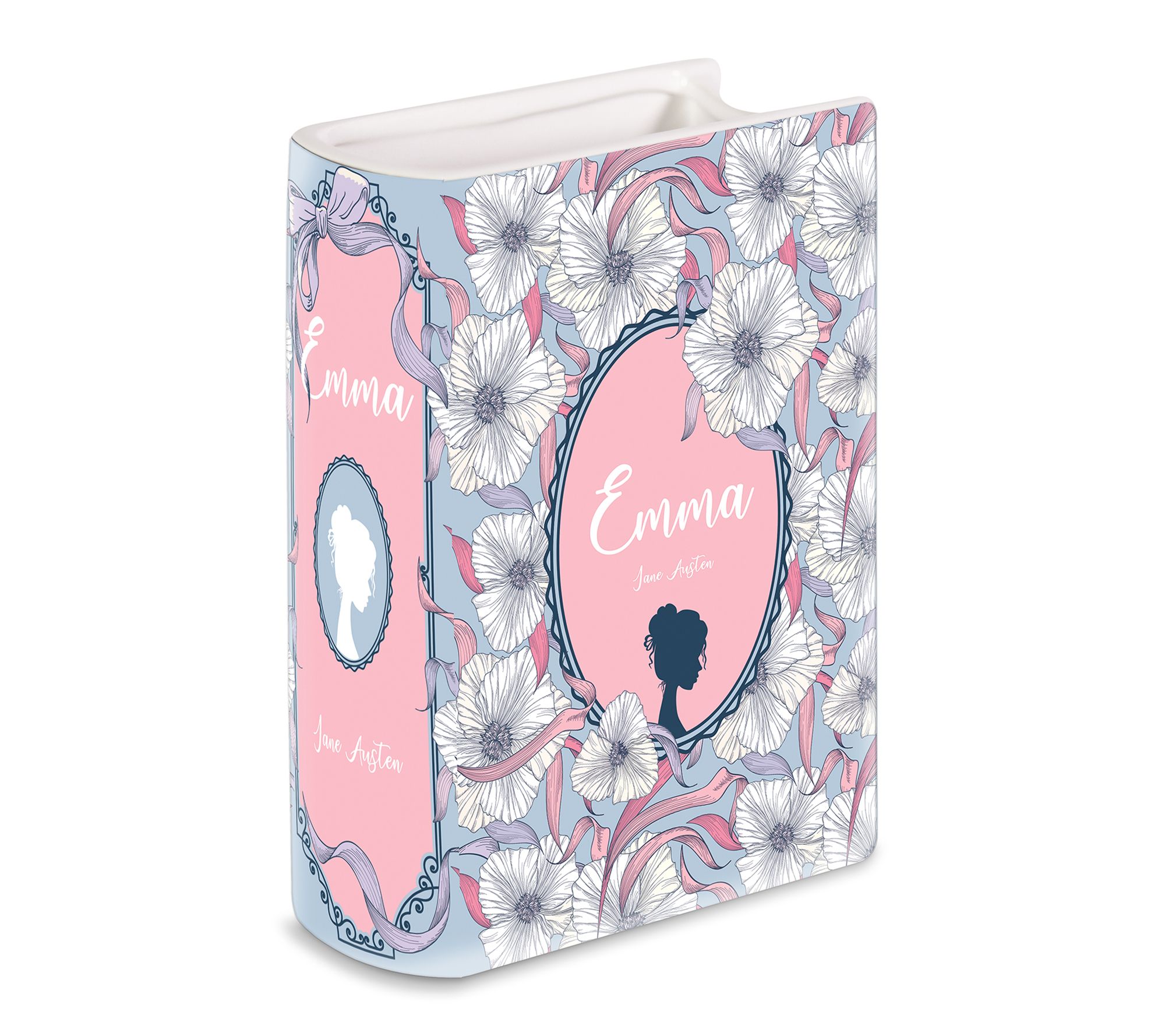Bring a touch of literary flair to your decor with this small ceramic vase inspired by Jane Austen's classic, Emma. Whether filled with vibrant blooms or used to organize pens and pencils, this decorative accent adds whimsical charm to any bookshelf, side table, or workspace. From Steel Mill & Co.