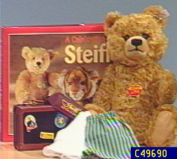 This new Steiff bear has a brand new design, its an original. It is made of dense curly brown mohair with a shaved muzzle, ultra suede paw pads and a growler. The bear is fully jointed and comes with a Teddy Bear passport, a suitcase, a pair of cotton shorts and a T-shirt. Also included is a copy of a book, "The Celebration of Steiff" -a 224 page book filled with interesting facts about Steiff with color pictures (hard back). Bear limited to 3500. Bear measures: 14"H. Book measures: 9-1/4" x 11-3/4". Made in Germany.