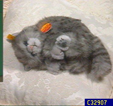 8" Grey-Striped Steiff Kitten. Posed lying aside, face looking up. Made of plush woven fur. Surface washing only is recommended. Made in Germany.
