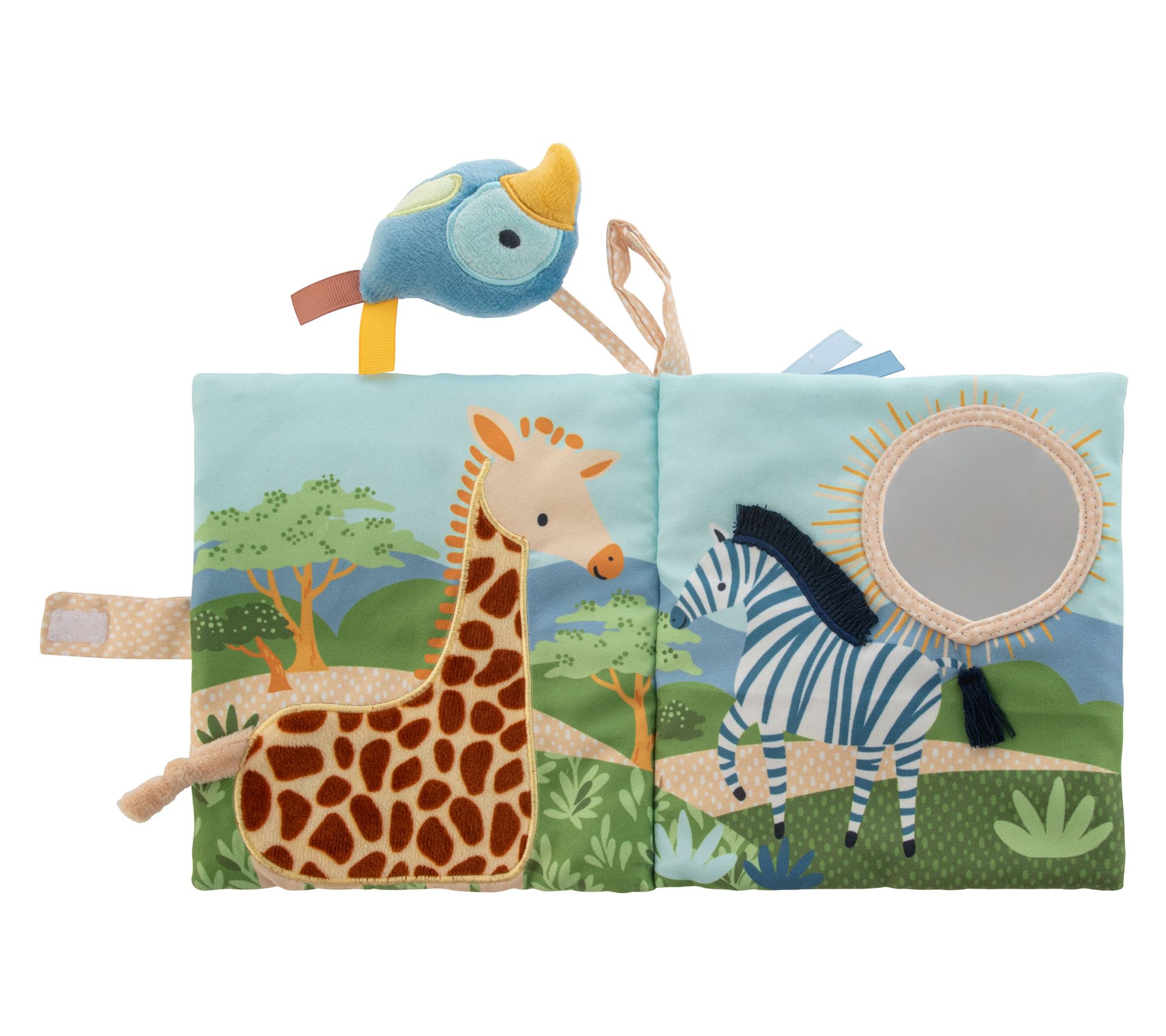 Explore endless sensory delights with this plush fabric book, offering six captivating pages for your baby's curious hands. It's more than just a book; it's a journey through textures, sounds, and reflections that support learning and development. Crinkle paper and squeak toys provide auditory fun, while mirrors stimulate visual engagement, making it perfect for everyday play moments or trips. Easy to bring along with its hanging hook and loop closure, it promises joy wherever your baby goes. From Stephen Joseph.