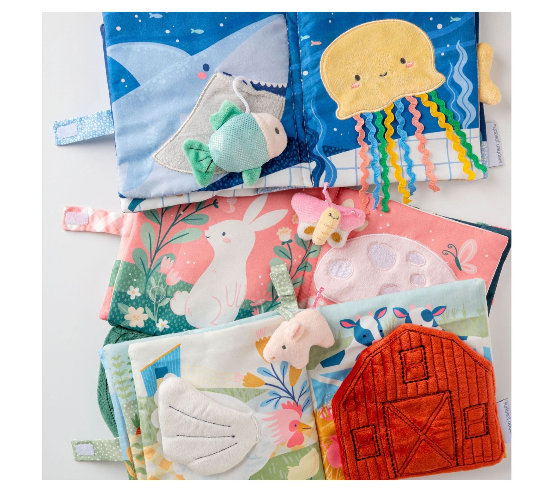 • Fabric book filled with squeak toys, crinkle paper, faux mirrors, and other tactile elements
