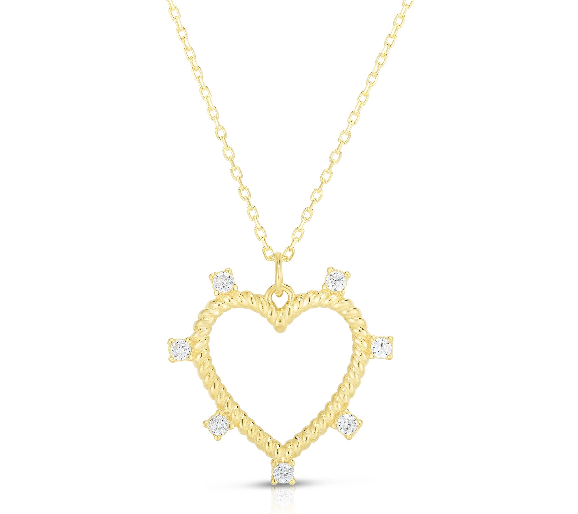 • Open heart pendant with twist texture; round, prong-set cubic zirconia accents; cable link chain