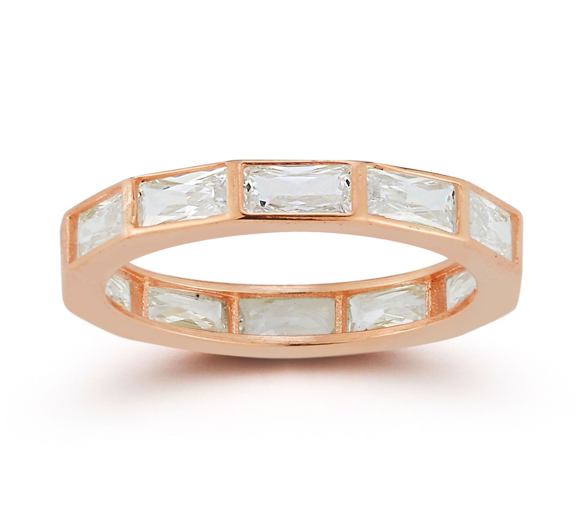 • Eternity design; baguette-cut, bezel-set cubic zirconia stones around band; polished finish
