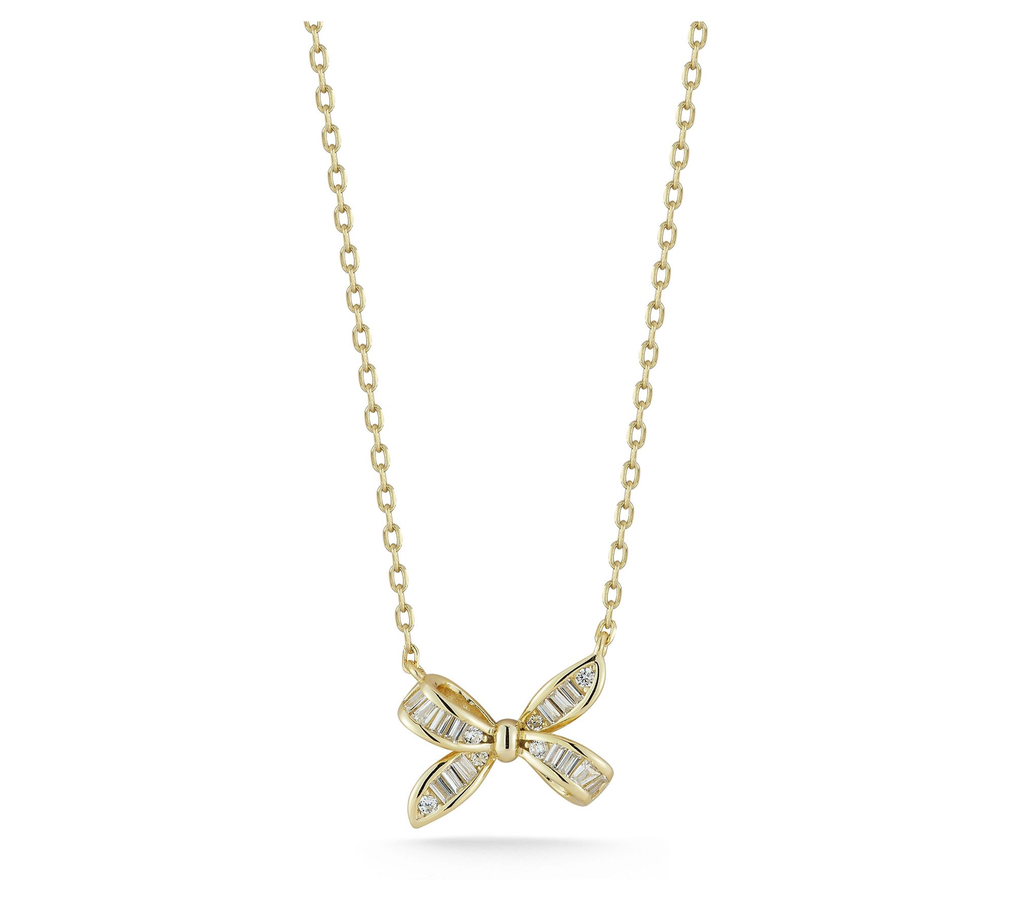 • Bow knot pendant with a baguette cubic zirconia; cable chain