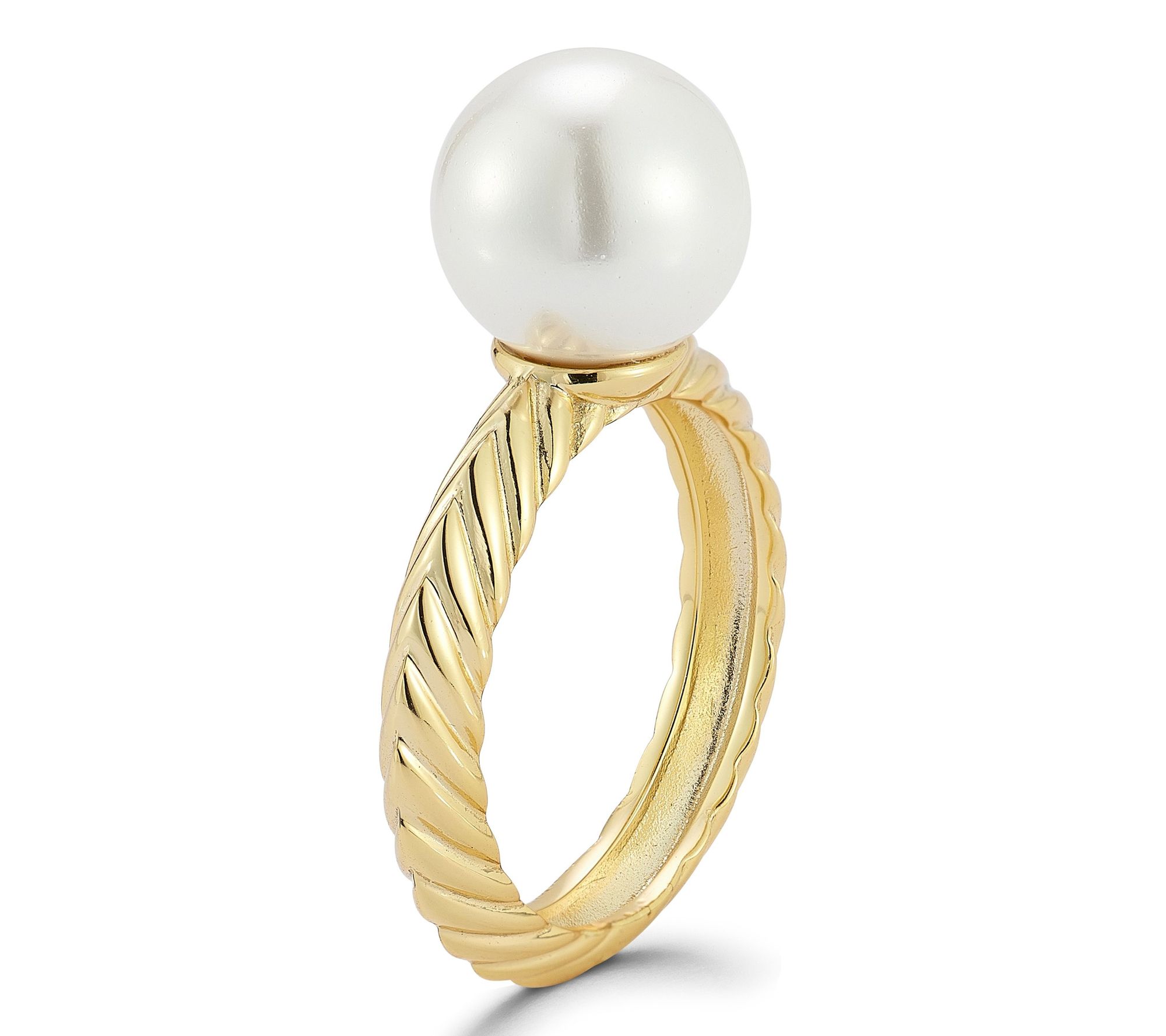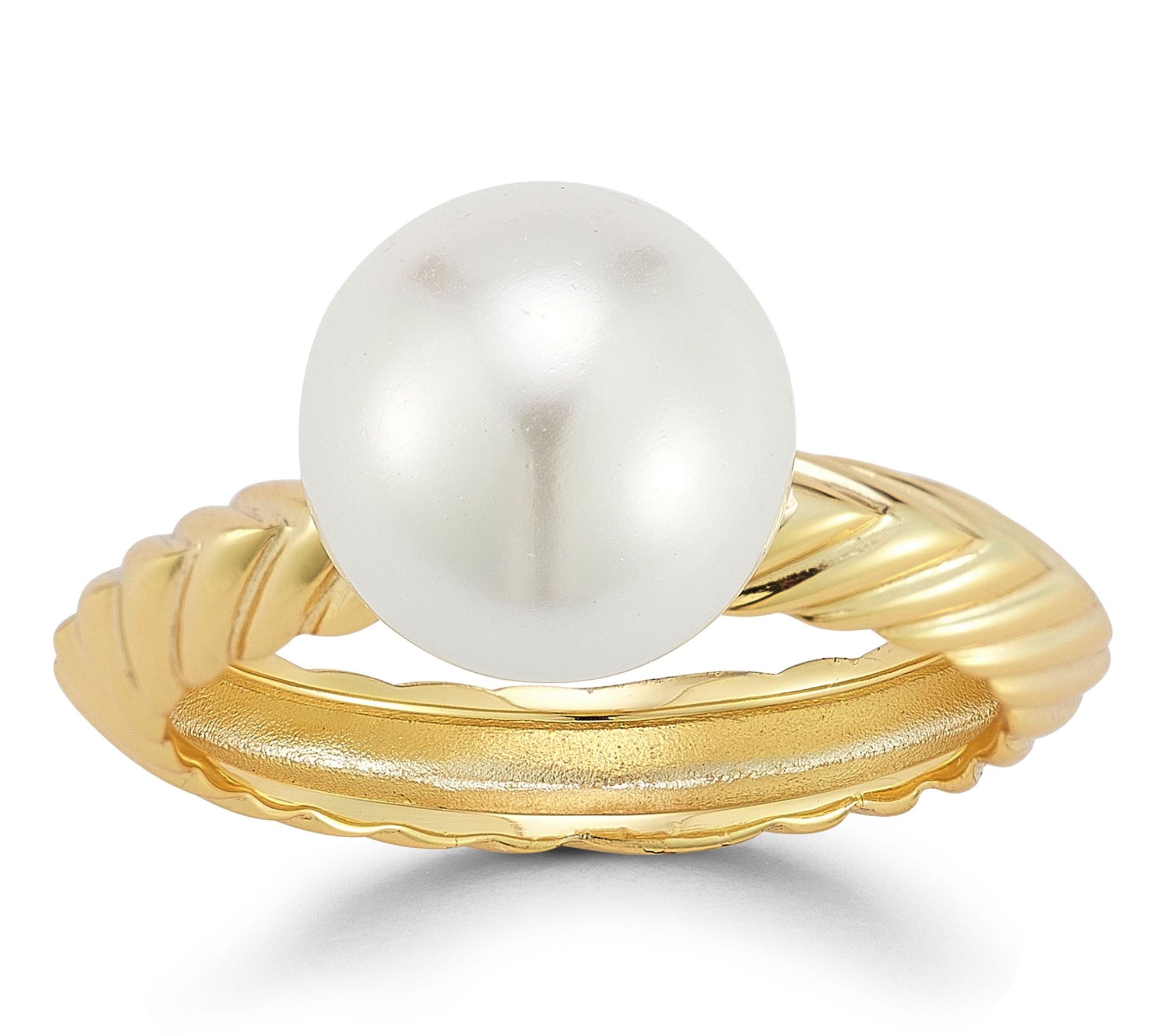 Braided band ring design with knife edge; cultured freshwater pearl at the center