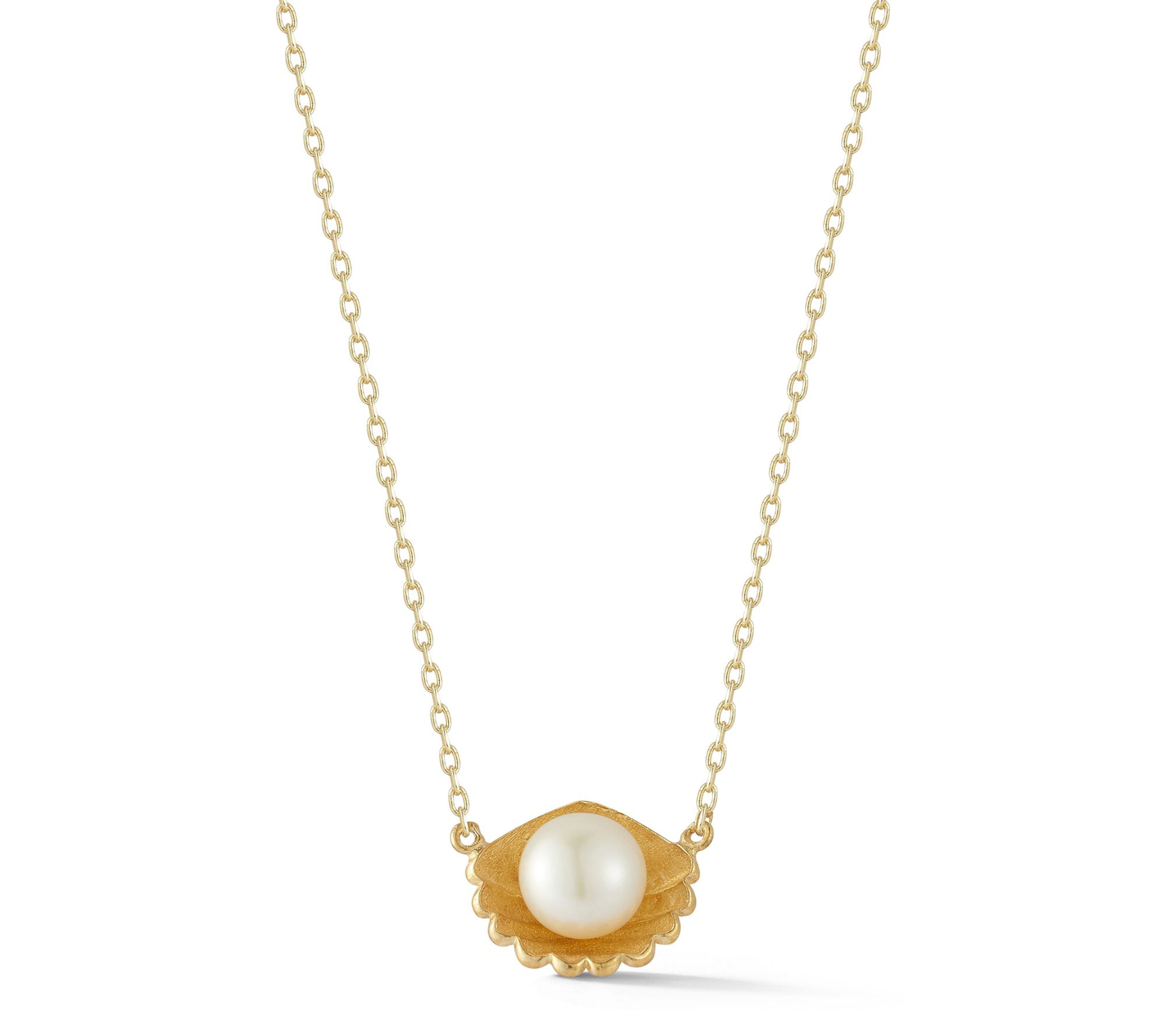 Bring coastal charm to your everyday style with this necklace featuring a gleaming clam shell pendant cradling a luminous cultured freshwater pearl at its center. Whether dressing up for a seaside soiree or adding a touch of elegance to your daily outfit, the oval link chain in your choice of 14K yellow gold-plated or rhodium-plated sterling silver offers a refined finish. From Sterlina Silver.