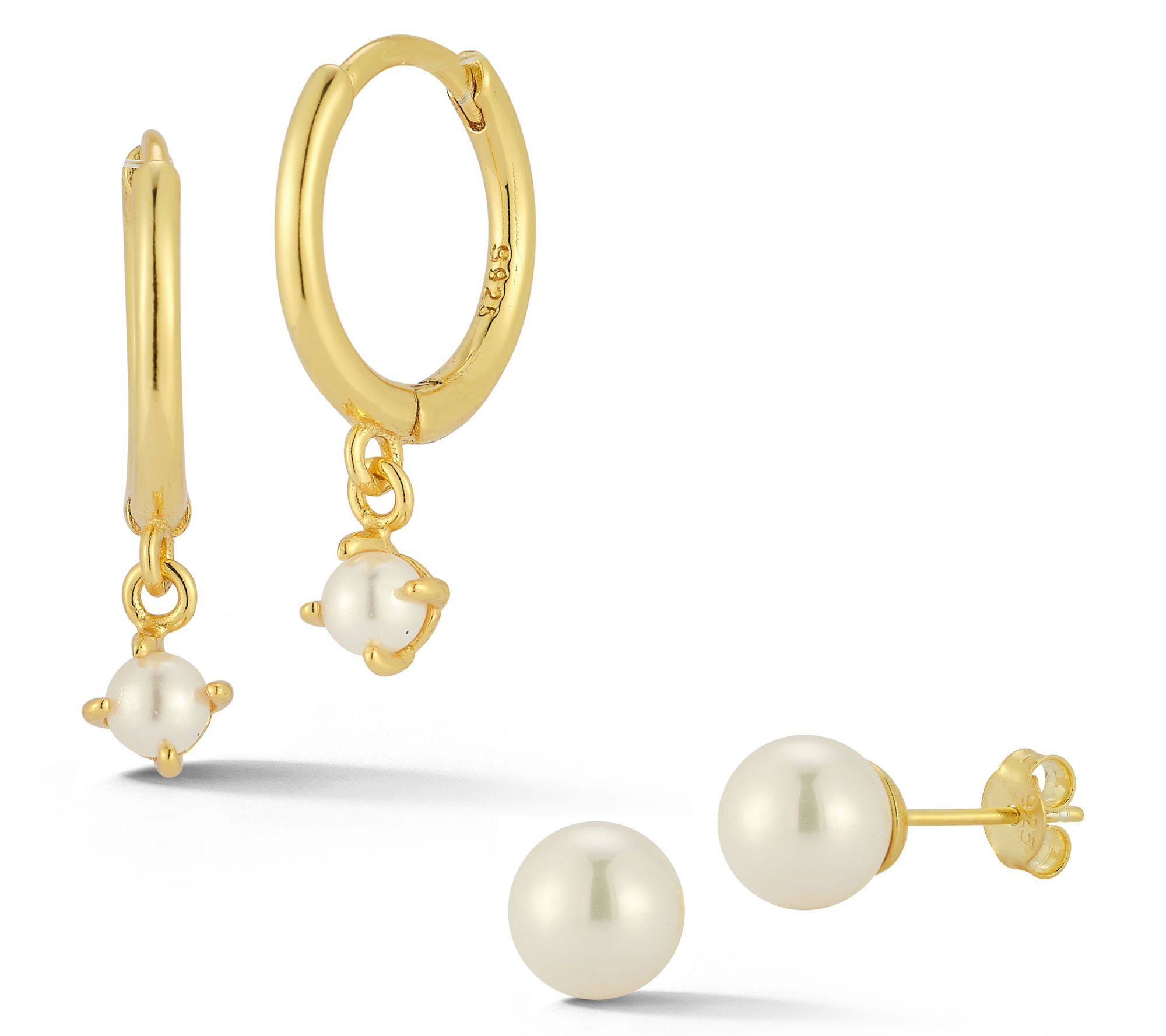 Includes round cultured freshwater pearl stud earrings and huggie hoop earrings with cultured freshwater pearl charms, jewelry pouch