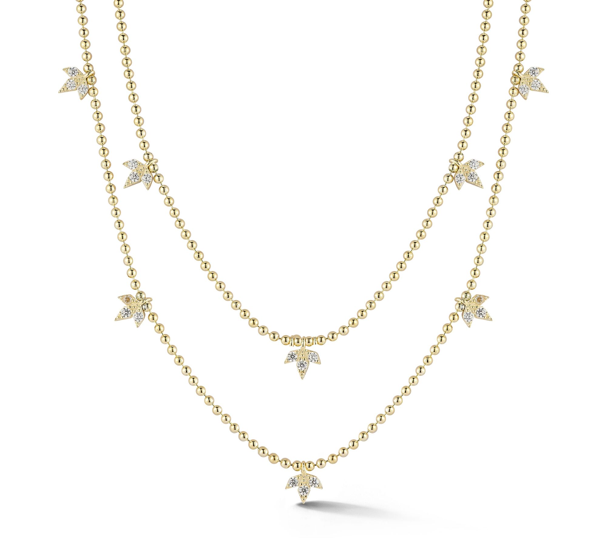 • Round, prong-set white cubic zirconia stones; double-layered bead chain; dainty leaf charms; polished finish