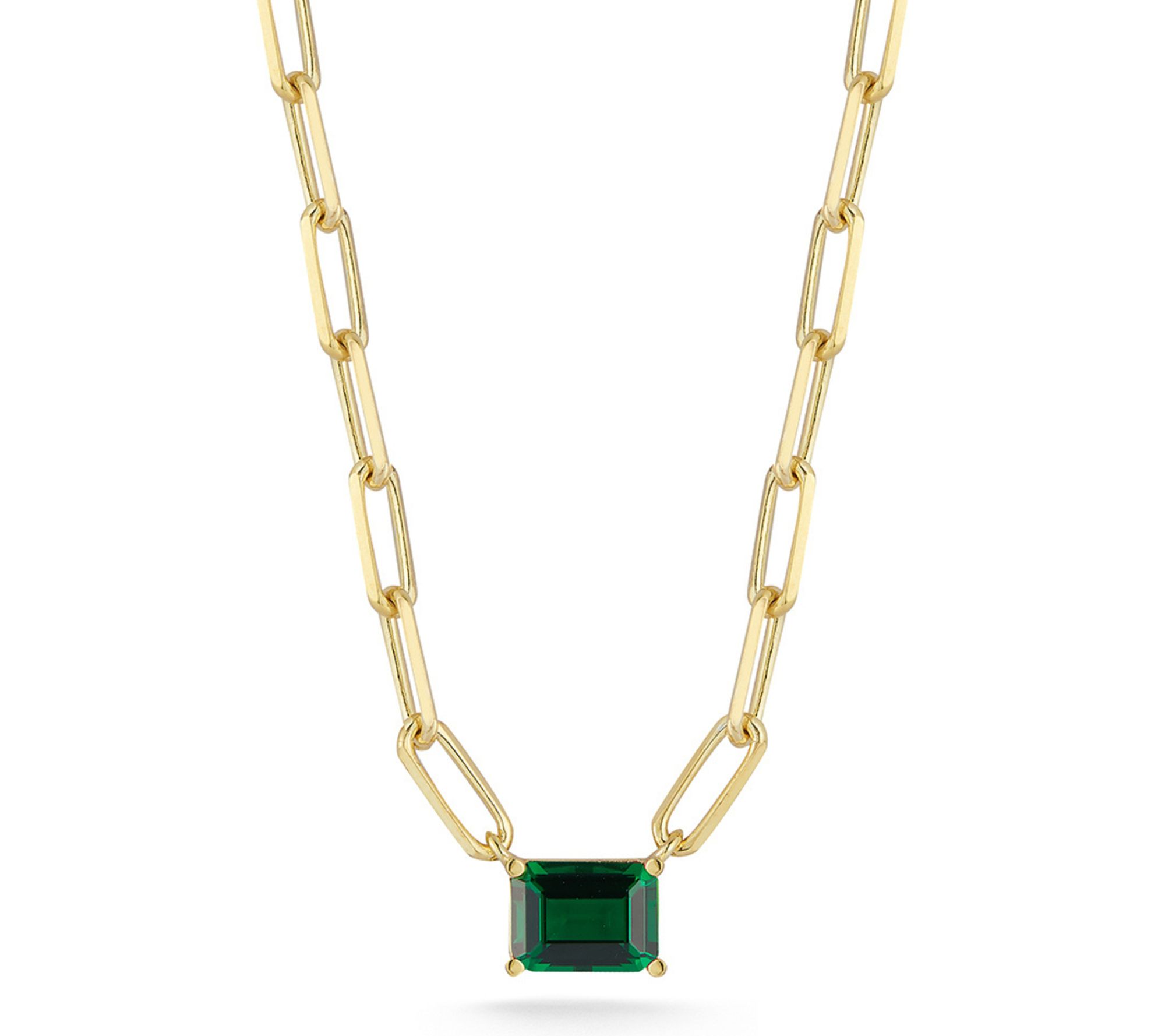 • Paperclip chain; colored emerald-cut cubic zirconia pendant; prong setting; polished finish