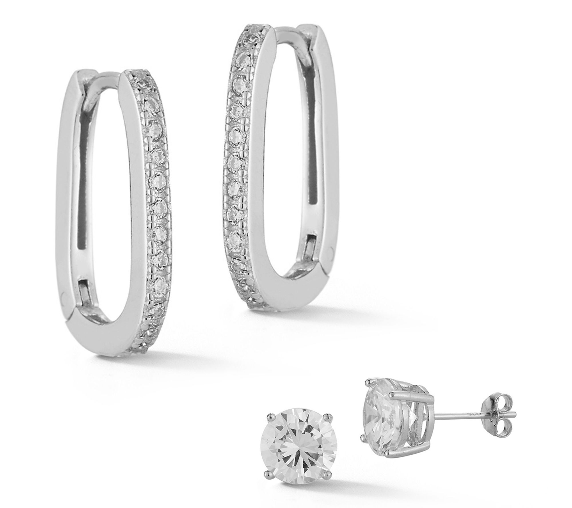 Two looks, endless possibilities -- this earring set includes sparkling round-cut stud earrings and oval huggie hoops, giving you stylish options for every event. Whether heading to brunch with friends or dressing up for a night out, the gleaming finishes and eye-catching simulated stones add a hint of glam to any moment. From Sterlina Silver.