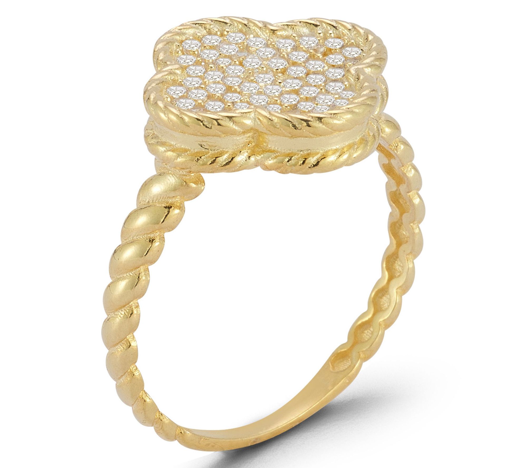 • Pave-set, round-cut cubic zirconia on a clover design at center; twist band