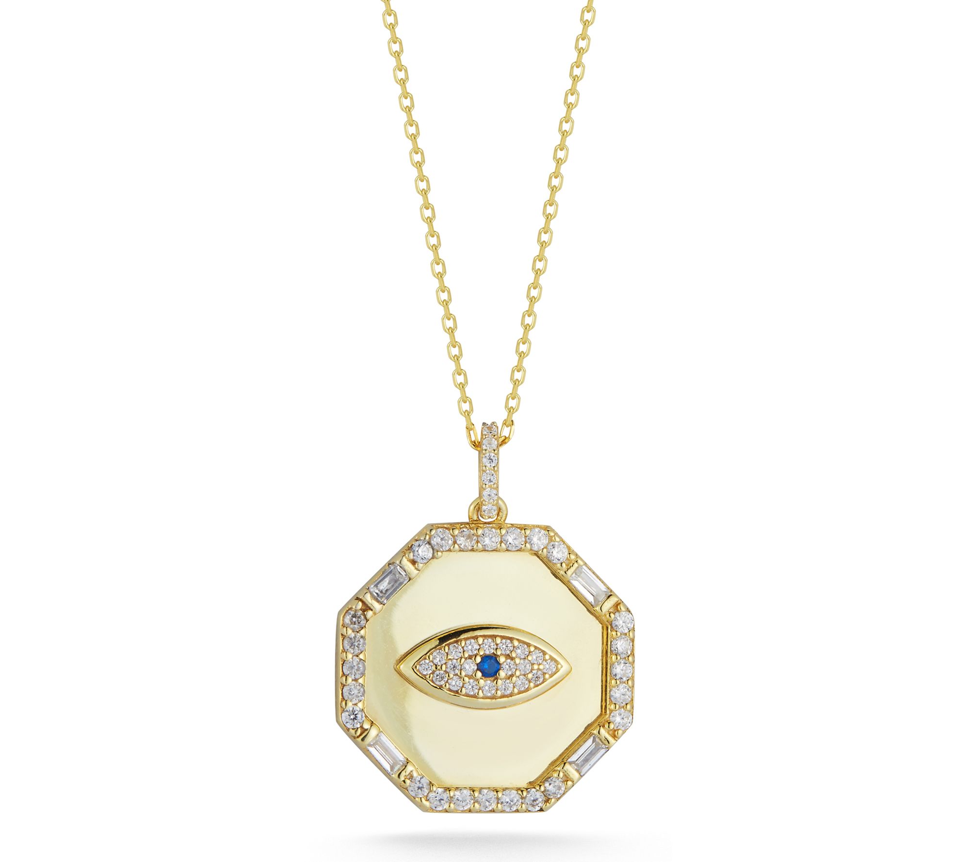 • Octagon-shaped pendant with evil eye design; baguette and round-cut, pave-set cubic zirconia; rolo link chain; polished finish
